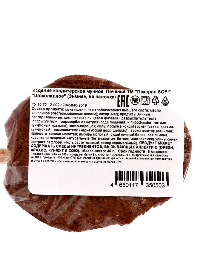 Состав продукта: мука пшеничная в/с; сахар; сахарная пудра; маргарин(масла растительные рафинированные дезодорированные, вода, ароматизатор натуральный); мед; продукты яичные; молоко питьевое; разрыхлитель теста (разрыхлители: гидрокарбонат натрия (сода пищевая) и пирофосфат натрия; кукурузный крахмал); какао-порошок; соль пищевая; корица; сухой яичный белок; имбирь молотый; ароматизатор (ванилин); красители пищевые натуральные (бета-каротин, куркумин, хлорофилл, карамельный колер, кармин, экстракт спирулины синей, уголь растительный); ароматизатор шоколад. Продукт может содержать ингредиенты, вызывающие аллергию.