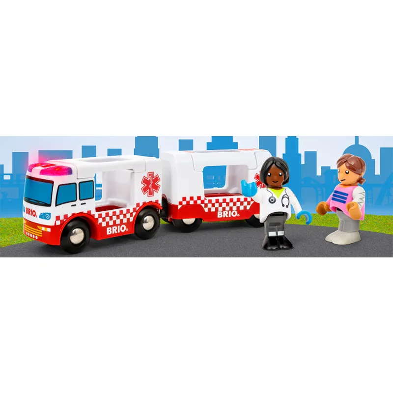 Спасательная скорая помощь Brio 36035 мчится на место происшествия, когда это необходимо! Мигающие огни и громкий сиреневый звук сообщают, что помощь уже в пути. В комплект входят две фигурки.