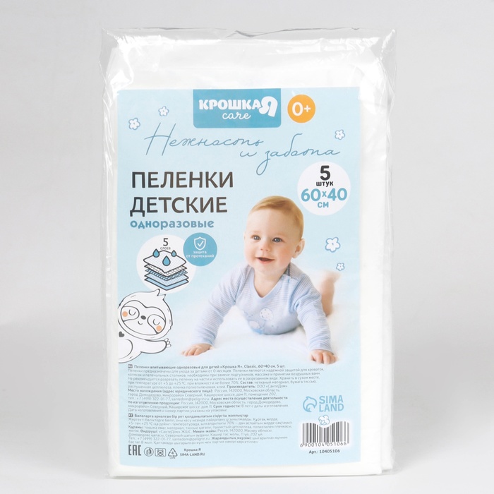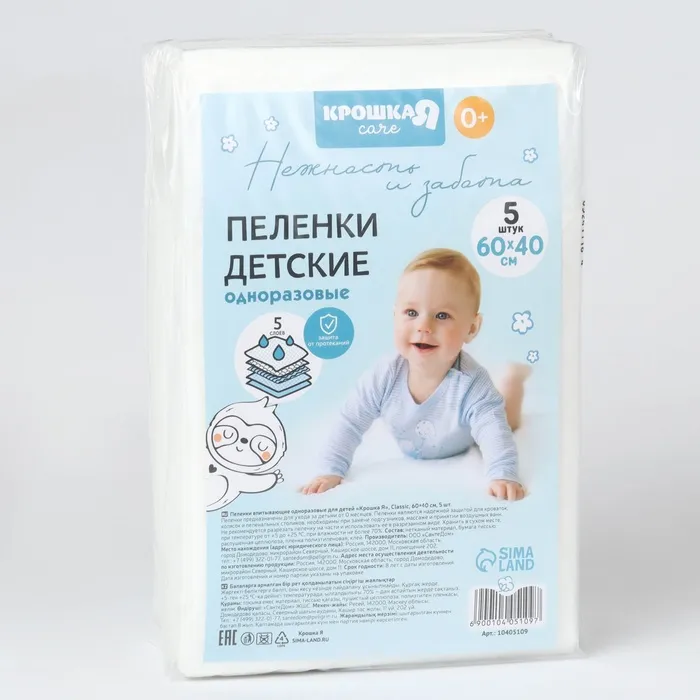 Пелёнки одноразовые впитывающие для детей, размер 60x40, 5 слоев, 5 шт., Крошка Я — Характеристики
