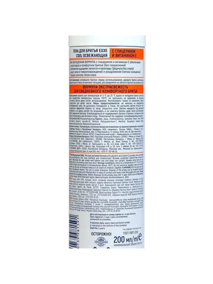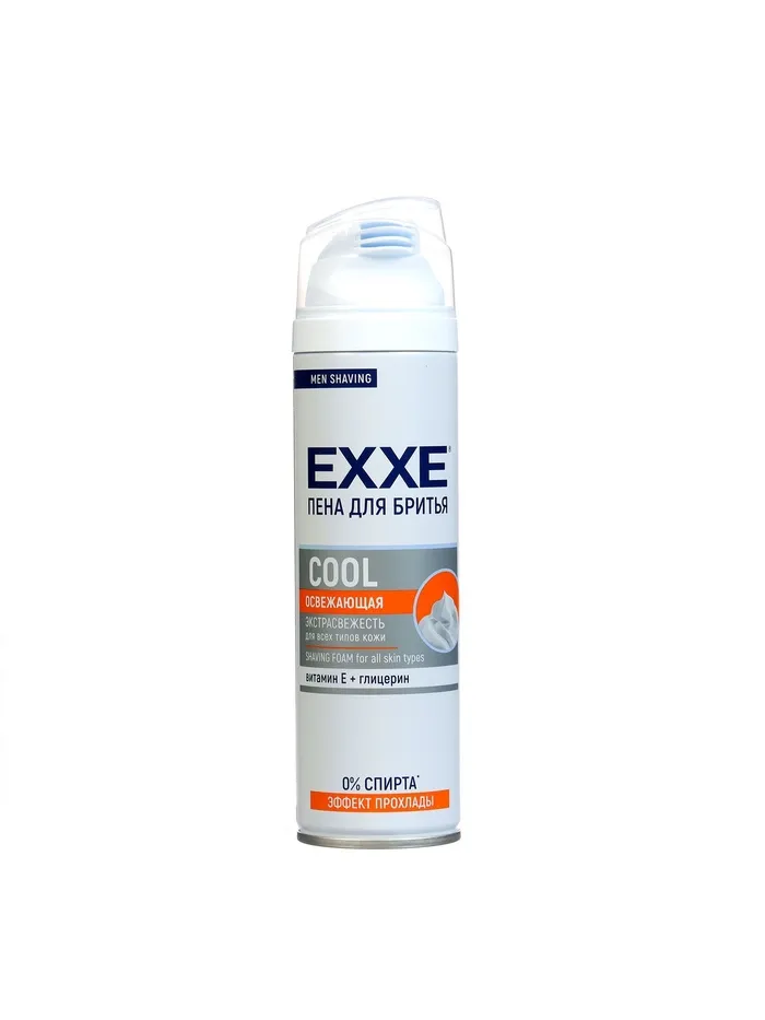 Пена для бритья Exxe Cool. Новая обогащенная формула с глицерином и витамином E обеспечивает ультрагладкое и комфортное бритье без покраснений, естественное ощущение легкости и прохлады формула без спирта с аллантоином, защиту кожи от микроповреждений и раздражений смягчает и увлажняет. Подходит для всех типов кожи.