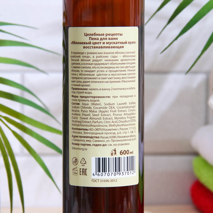 Пена для ванн Целебные рецепты «Яблоневый цвет и мускатный орех», восстанавливающая прекрасно увлажняет и смягчает кожу. Восстанавливает силы, создает ощущение гармонии и покоя, дарит отличное настроение. Обильная и устойчивая пена. Изысканный и тонкий аромат.