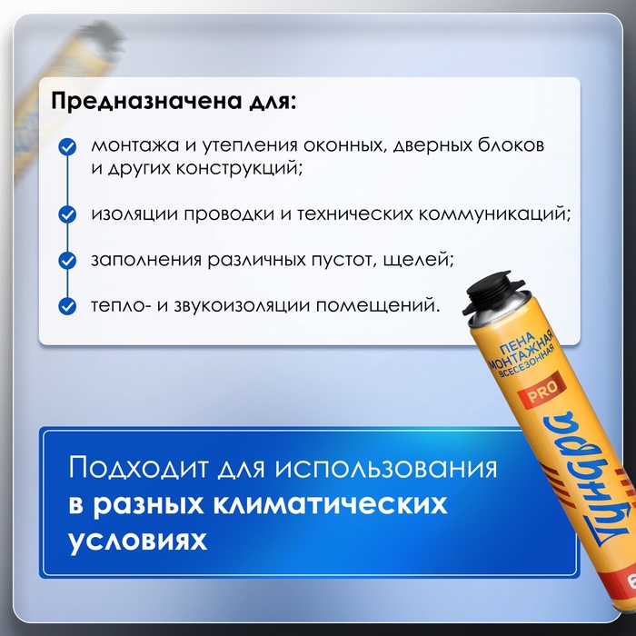 Пена монтажная всесезонная от марки «ТУНДРА» подходит для использования в разных климатических условиях. Предназначена для монтажа и уплотнения оконных, дверных блоков и других конструкций, для изоляции проводки и технических коммуникаций, заполнения различных пустот, щелей, для тепло- и звукоизоляции помещений.