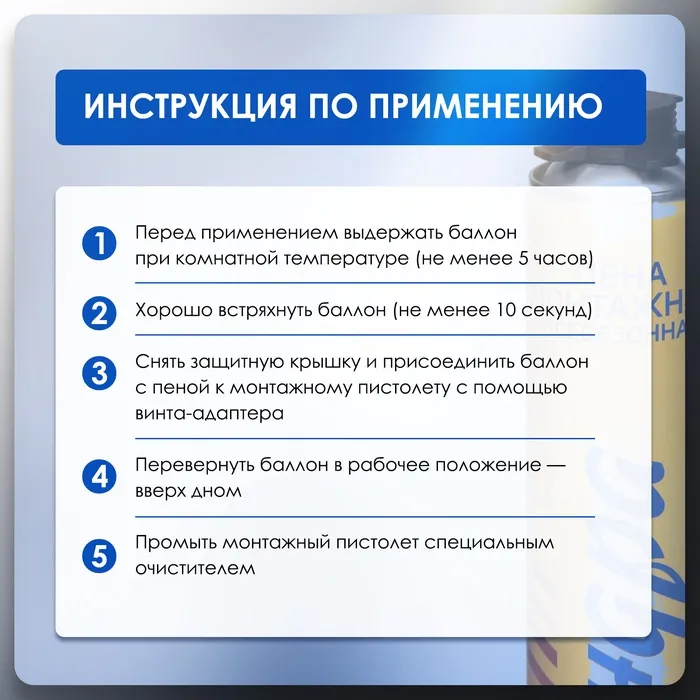 Инструкция по применению:- Перед применением выдержать баллон при комнантной температуре (не менее 5 часов).