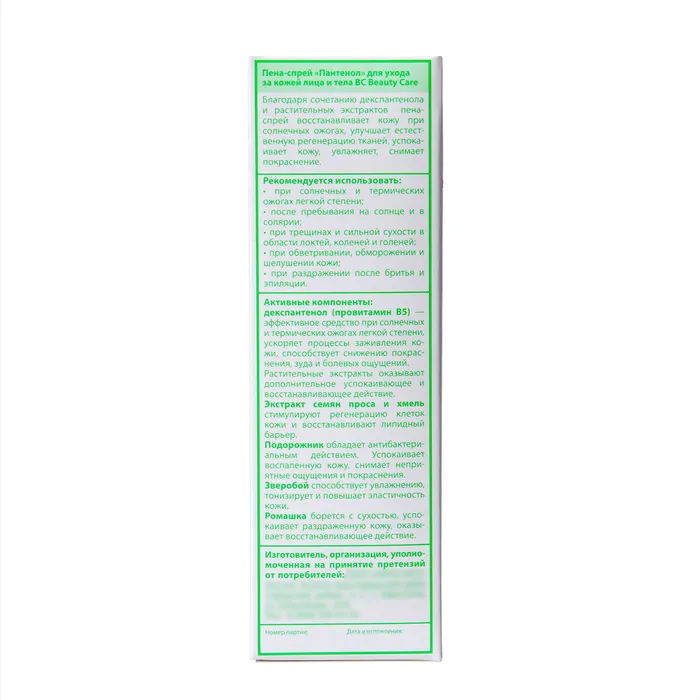Пена-спрей для лица и тела Пантенол ВС - оказывает быструю помощь при солнечных и термических ожогах, улучшает естественную регенерацию тканей. Новая формула с маслом облепихи и экстрактом череды бережно ухаживает за кожей, успокаивает, увлажняет кожу и снимает покраснение.