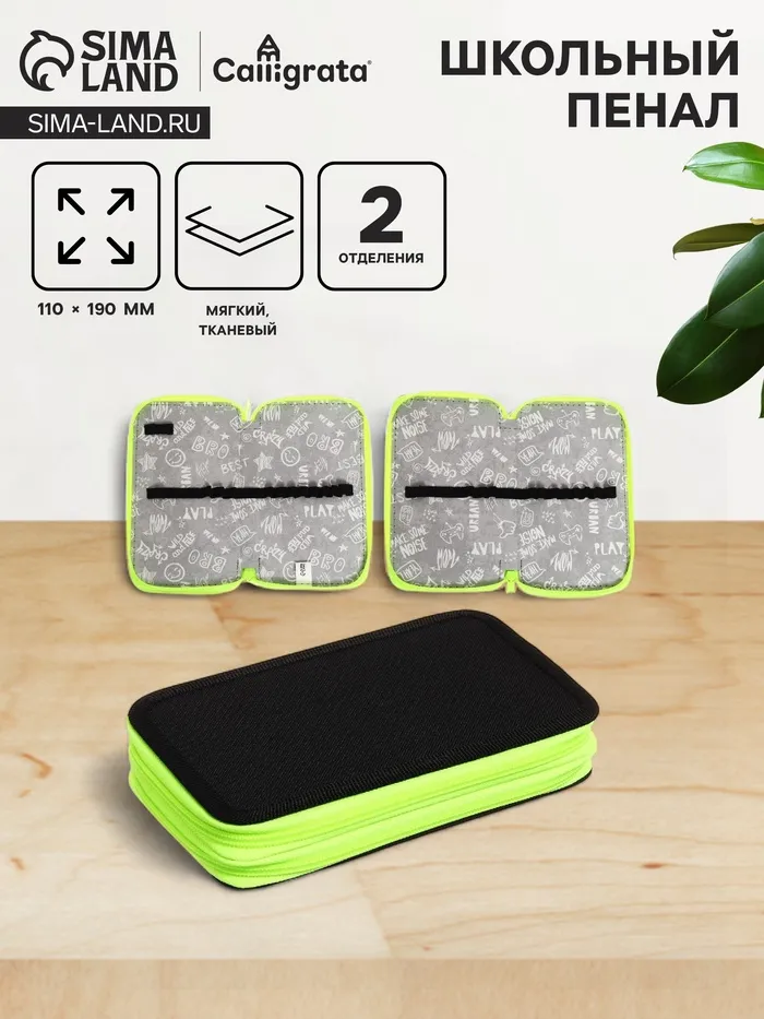 Пенал школьный «Чёрный-ярко-салатовый», 2 секции, 110×190 — Характеристики