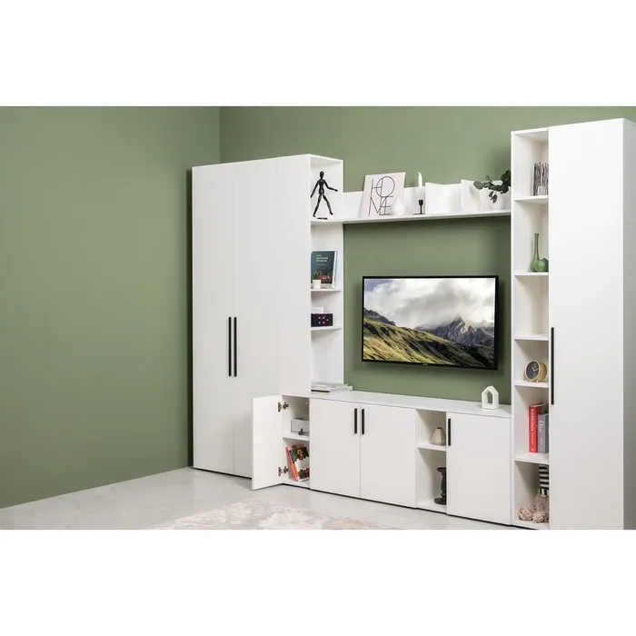 - Функциональность: сочетание открытых полок и закрытых секций обеспечивает удобное хранение как декоративных элементов, так и личных вещей.