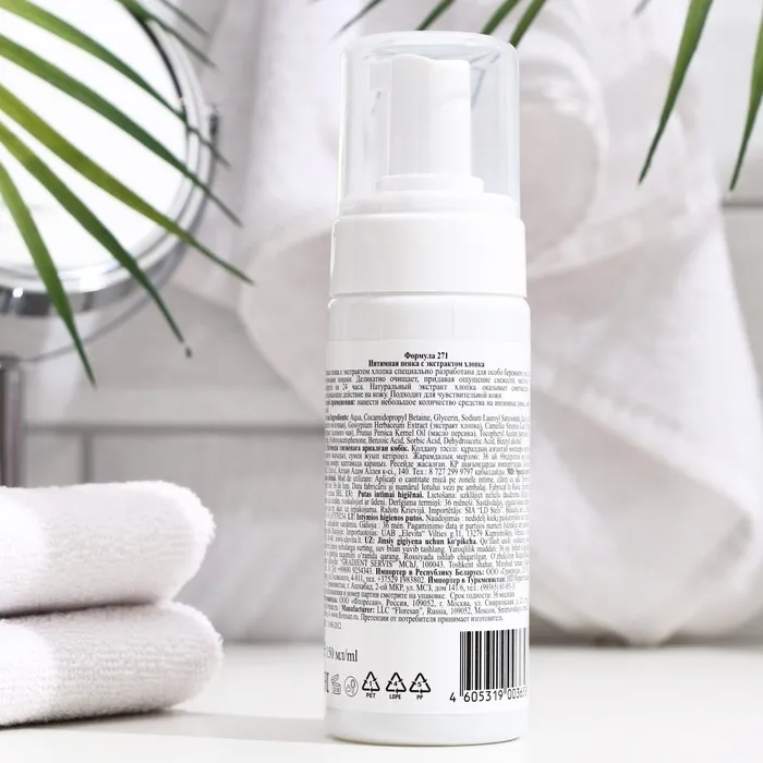- Пенка бережно очищает интимную зону, не нарушая естественный баланс микрофлоры и не вызывая раздражений, что особенно важно для чувствительной кожи.