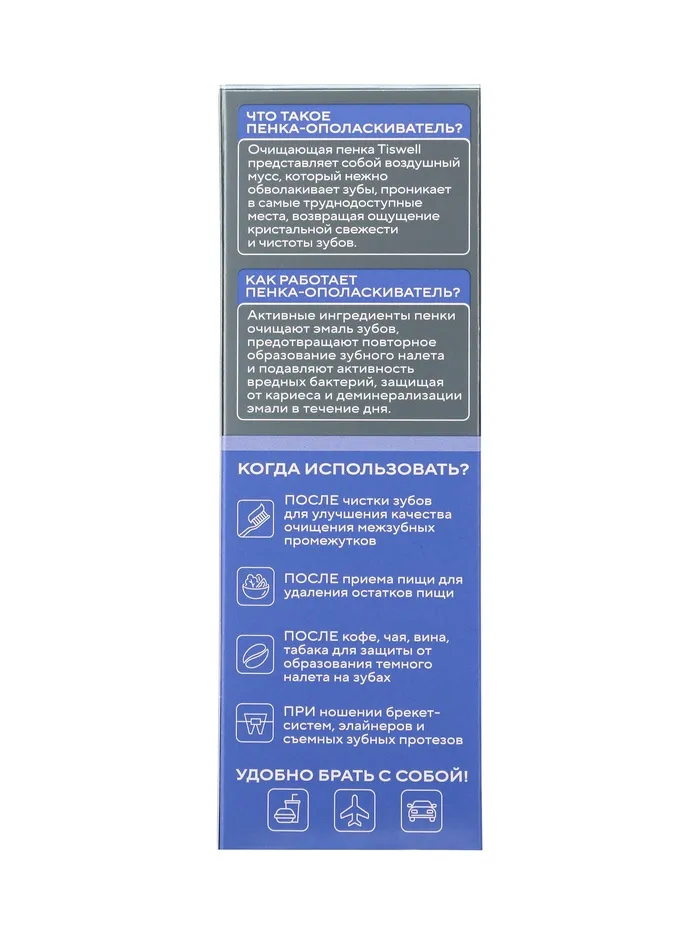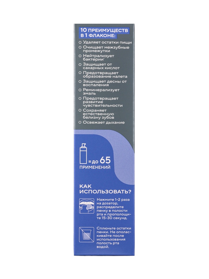 Способ применения: нанесите небольшое количество пенки на зубную щётку или непосредственно во рту, аккуратно распределите по зубам и дёснам, затем сплюньте. Не глотать. Использовать 1–2 раза в день после чистки зубов.