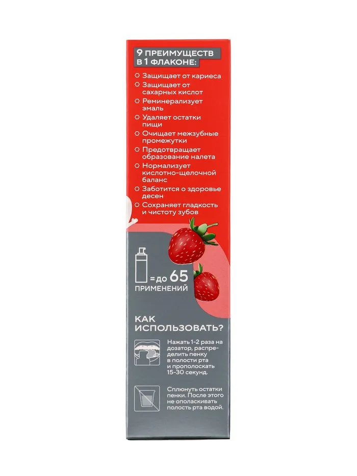 Способ применения: нанести небольшое количество пенки на зубную щётку или во рту, равномерно распределить по зубам и дёснам, затем сплюнуть. Не глотать. Использовать 1–2 раза в день после чистки зубов.