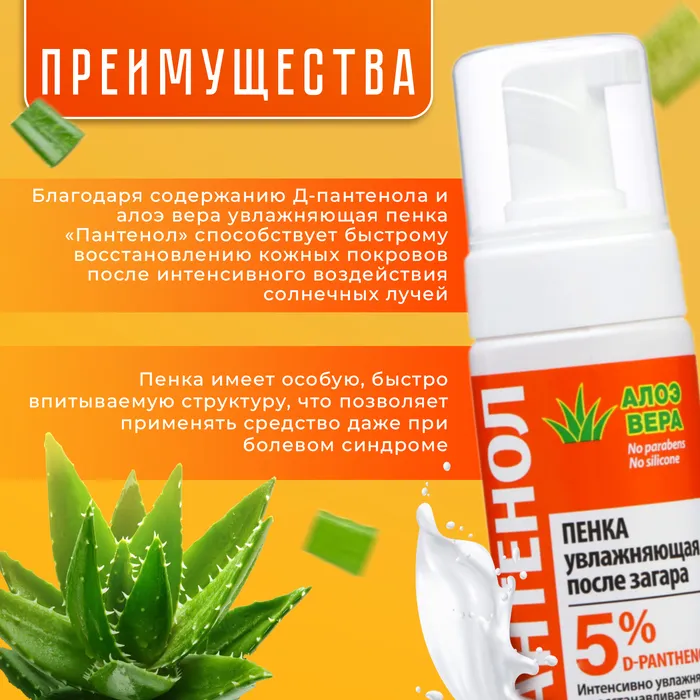 Благодаря содержанию Д-пантенола и алоэ вера увлажняющая пенка Пантенол способствует быстрому восстановлению кожных покровов после интенсивного воздействия солнечных лучей. Пенка имеет особую, быстро впитываемую структуру, что позволяет применять средство даже при болевом синдроме. Быстро успокаивает, глубоко увлажняет, питает и смягчает чувствительную и поврежденную кожу. Рекомендовано для любого типа кожи.