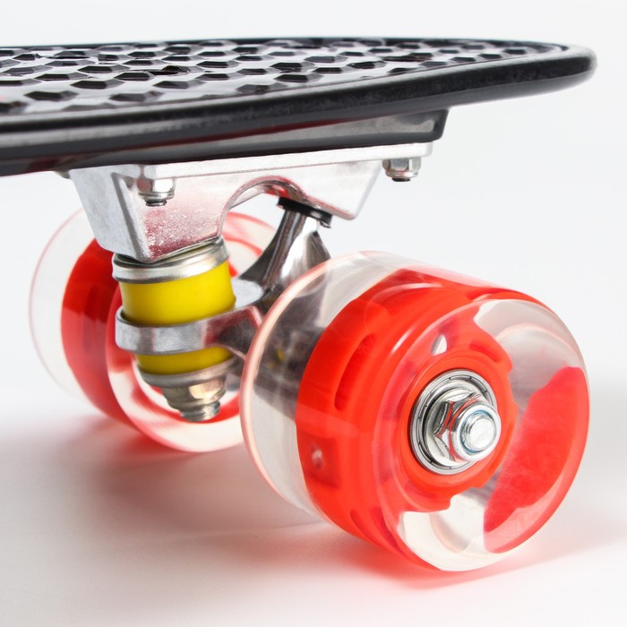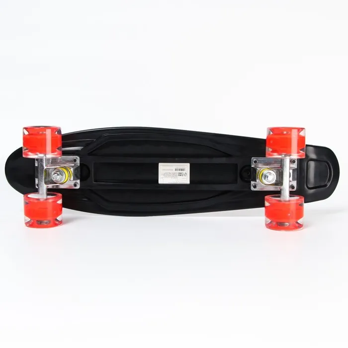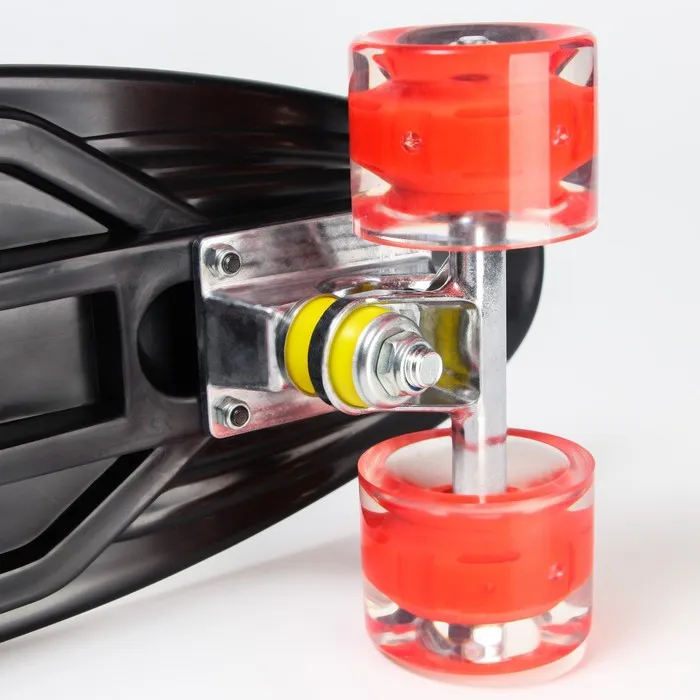 Детский скейтборд со светящимися колесами и красочным принтом покорит любого ребенка своим дизайном, а родителей продуманной до мелочей конструкцией и ее безопасностью!. Дека пенниборда сделана из прочного пластика, его преимущество заключается в том, что со временем он не деформируется в отличие от деревянных скейтбордов. Дека имеет антискользящее ребристое покрытие для безопасности вашего ребенка, а светящиеся колеса обезопасят катание в темное время суток. Маневренная подвеска упрощает контроль за управлением движения круизера и смягчает неровности. За счёт больших, мягких и широких колёс перемещение по улицам становится приятным и скоростным.