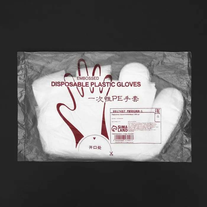 Материал: Перчатки изготовлены из полиэтилена - легкого, прочного и прочного материала, обеспечивающего надежную защиту рук от загрязнений и контакта с различными веществами.
