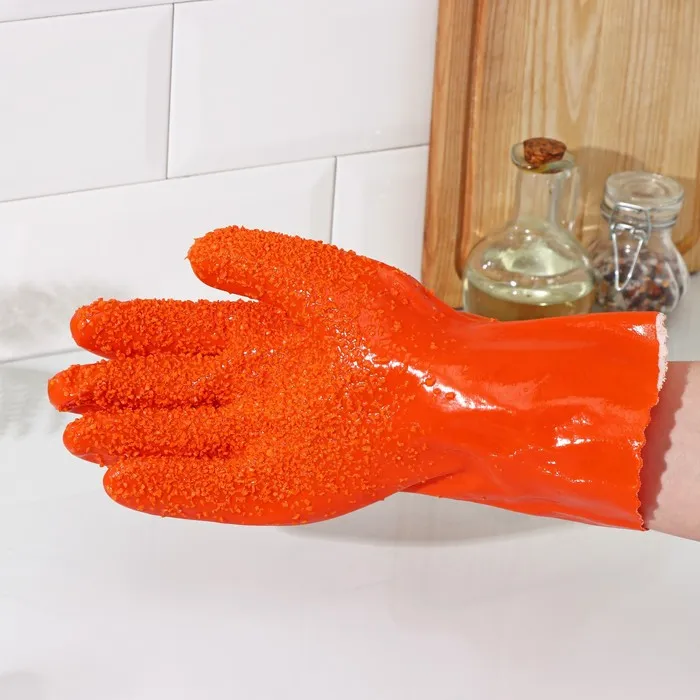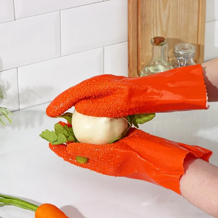 Перчатки с крошкой из ПВХ упростят вам очистку овощей или рыбы. Благодаря твёрдым частицам на рабочей поверхности перчаток вам не придется больше чистить картошку ножом или овощечисткой. Перчатки работают по принципу наждачной бумаги. Например, Вы вращаете картофельный клубень в этих перчатках, и кожура полностью слезает с корнеплодов. Также они будут полезны для очистки рыбы от чешуи.