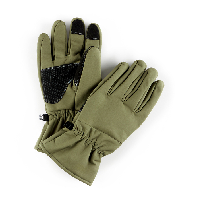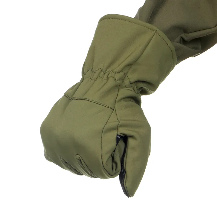 Верхний слой перчаток выполнен из материала софтшелл (Softshell), который широко используется в производстве функциональной одежды для туризма, спорта, охоты и рыбалки. Этот материал сочетает в себе прочность, эластичность, хорошо пропускает воздух и отводит влагу тела, а так же быстро сохнет. Перчатки также оснащены утеплителем из флиса, который сохраняет тепло рук при низких температурах.