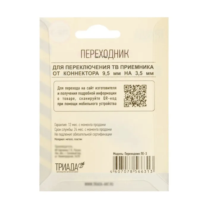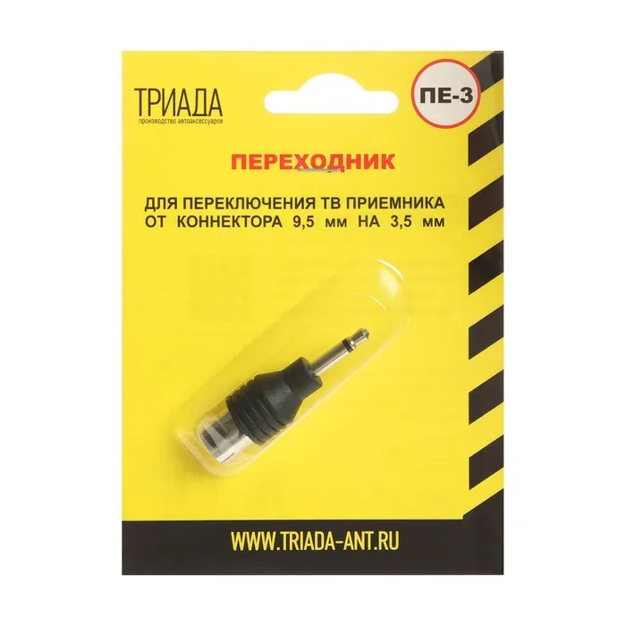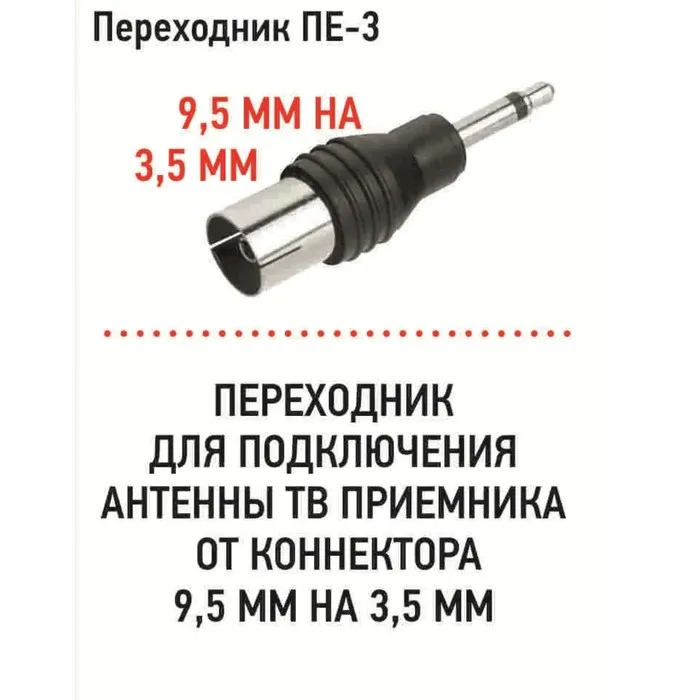 Переходник для подключения антенны ТВ приемника от коннектора 9,5мм на 3,5 мм Поскольку существуют несколько стандартов входных гнезд для телевидения, Вам может понадобиться такой переходник.