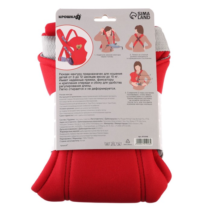 Переноска для малыша, эргорюкзак, слинг «Моё сердечко», от 3 до 10 кг, красная, Крошка Я — Характеристики