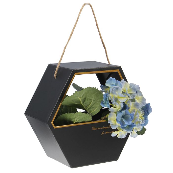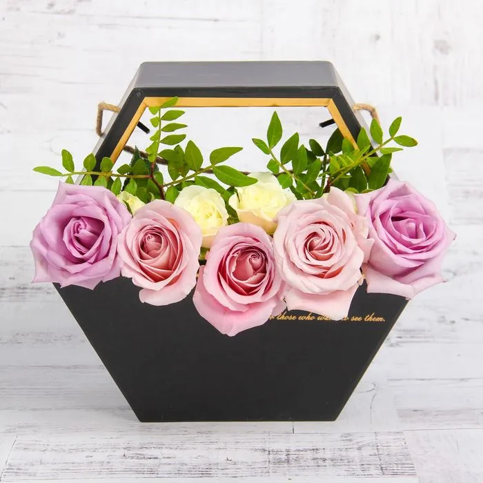 Идеальное решение для цветочных подарков: Эта переноска особенно подходит для праздничных букетов на 8 Марта, дни рождения и другие торжества. Шестиугольная форма добавляет композиции устойчивости, а чёрный цвет придаёт ей стильное завершение. Переноска становится частью презента, обеспечивая удобство и сохранность букета до момента вручения.