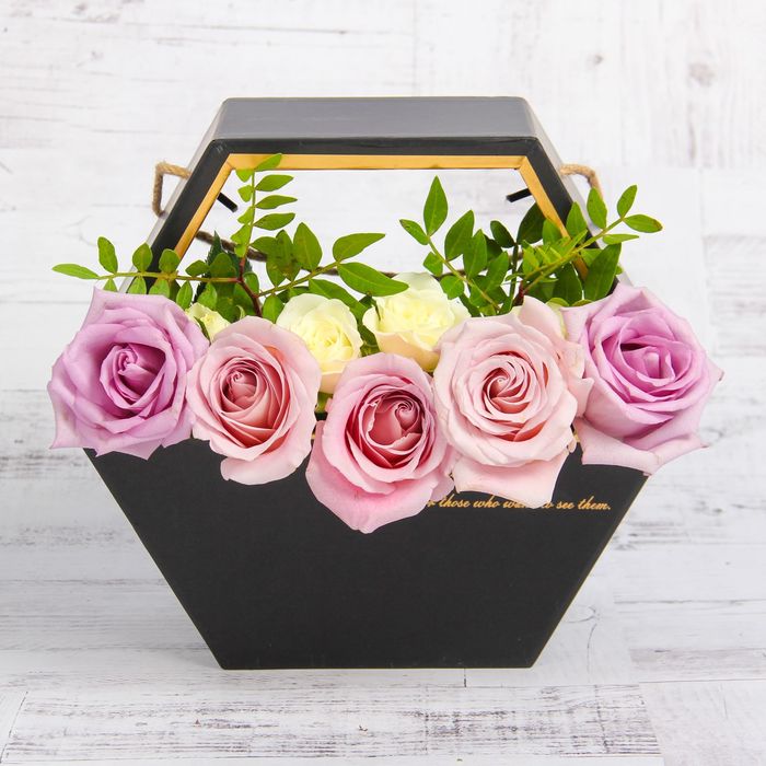 - Шестиугольная форма: Нестандартная геометрия обеспечивает устойчивость и равномерное распределение нагрузки. Букет сохраняет форму при переноске, не сминается и не перекашивается.