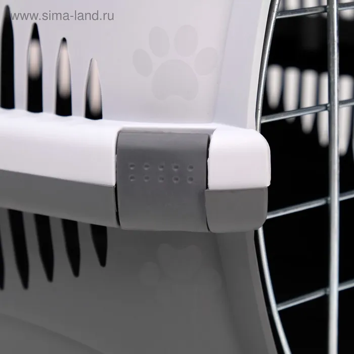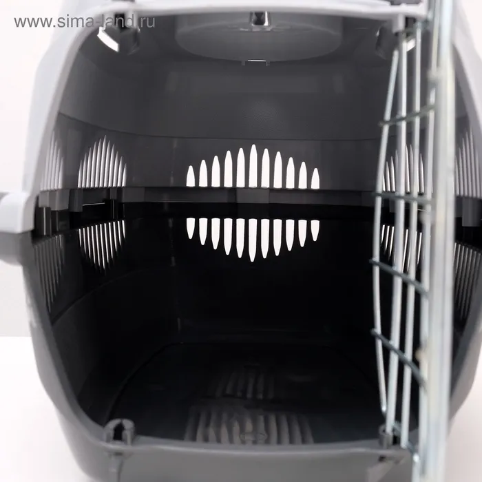 Переноска имеет приятный внешний вид, достаточно вместительна, есть вентиляционные отверстия в боковых частях, решетчатая металлическая дверца и удобная ручка.