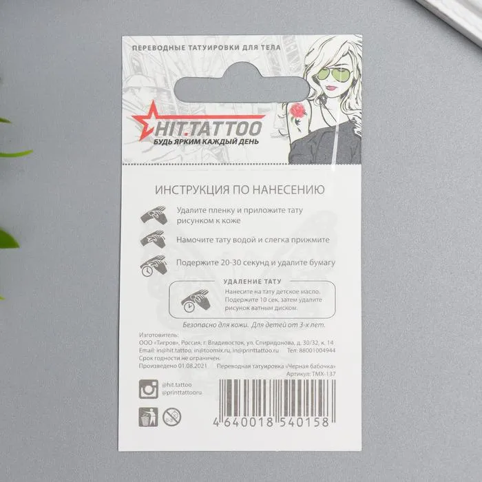 Элегантная чёрная бабочка размером 5.3×6.3 см — это мгновенное преображение вашего образа без игл и боли. Её изящные крылья с детализированным узором создают эффект настоящего тату, добавляя образу загадочности и стиля.