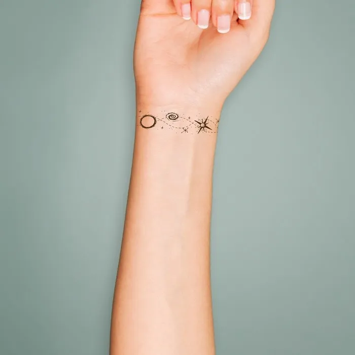 - Необычный дизайн: Татуировка в виде браслета на космическую тематику придаст вашему образу загадочность и уникальность. Это отличное решение для тех, кто стремится самовыражаться.