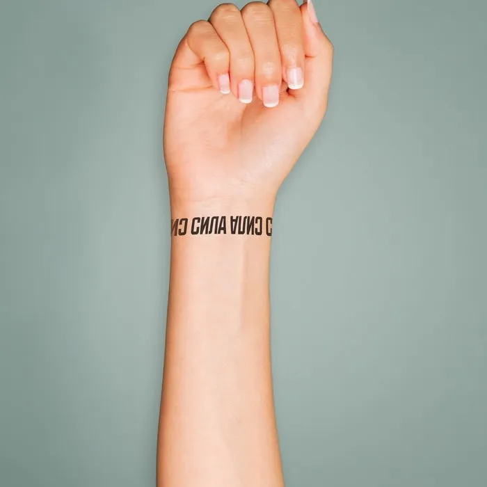 - Эстетика минимализма: Черная татуировка выполнена в виде браслета с надписью, олицетворяющей силу и уверенность. Это замечательный способ подчеркнуть свою индивидуальность без постоянных изменений.