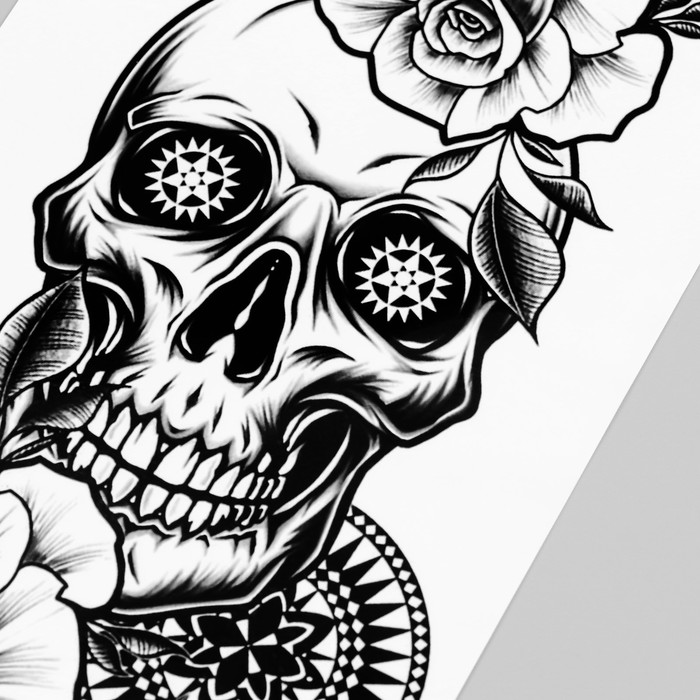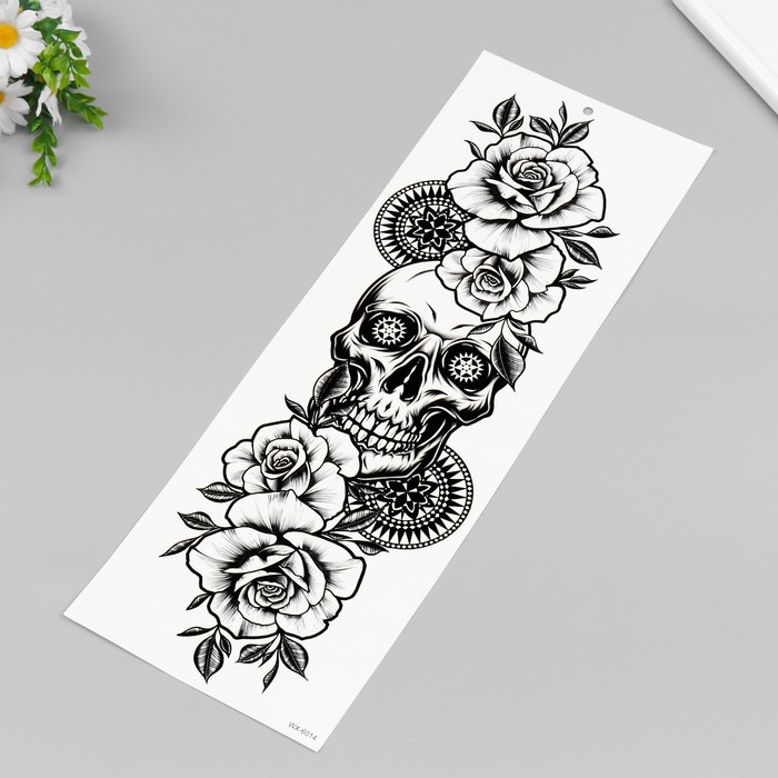 Переводная тату на тело чёрная «Череп в цветах», 48×17 см — Характеристики