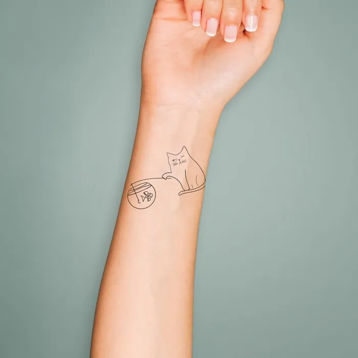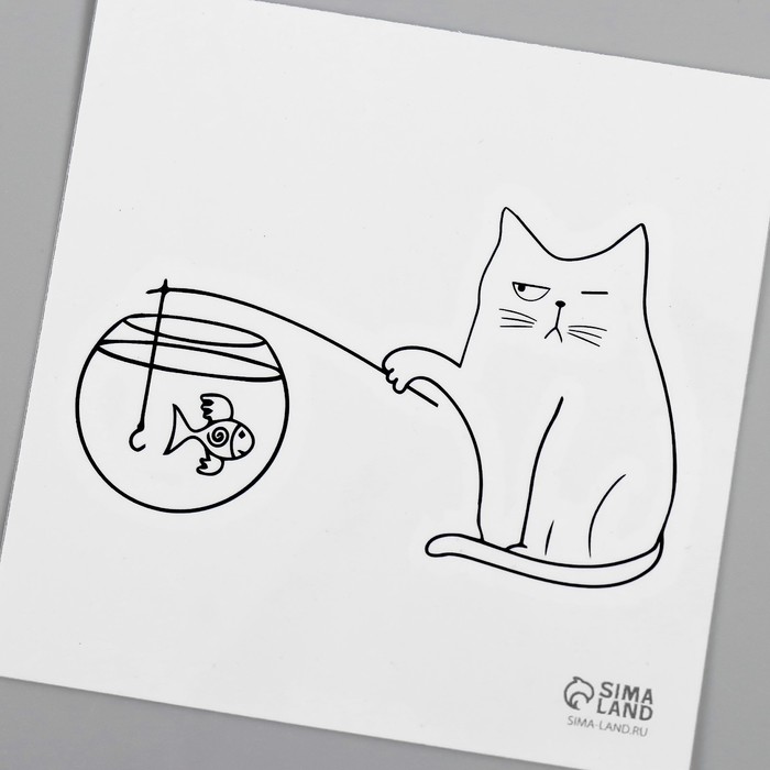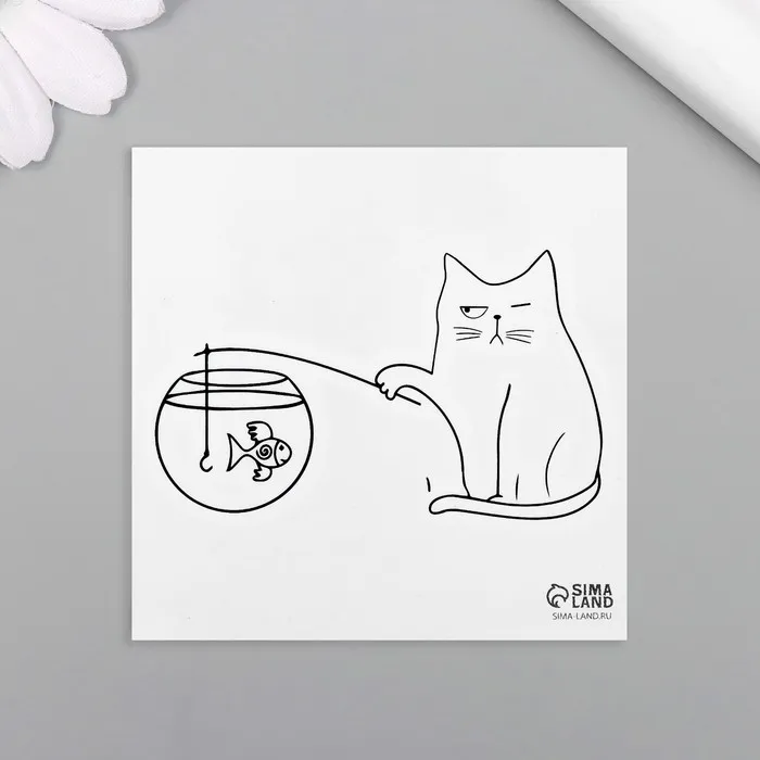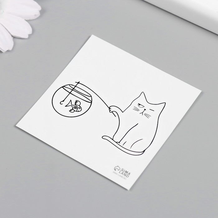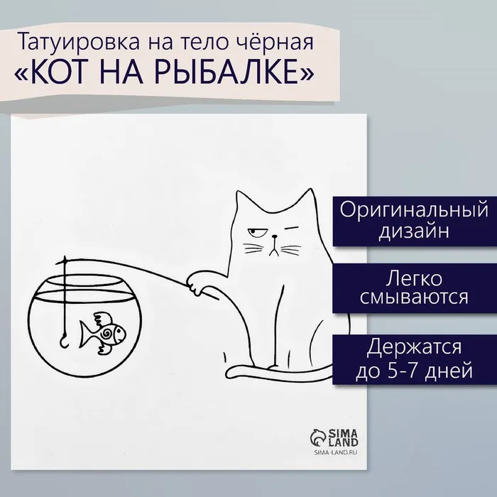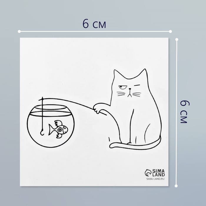 Переводная тату на тело чёрная «Кот на рыбалке», 6×6 см — Характеристики