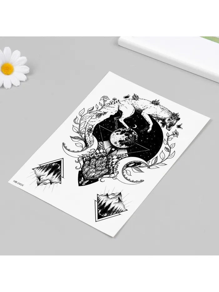- Эстетика и универсальность: Татуировка представляет собой изображение фантастического животного и природы, выполненное в чёрных тонах. Это делает её идеальным аксессуаром для тематических мероприятий, вечеринок или просто для выразительного повседневного стиля.