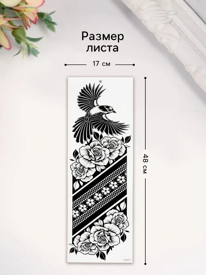 Переводная тату на тело чёрная «Птица и розы», 48×17 см — Характеристики