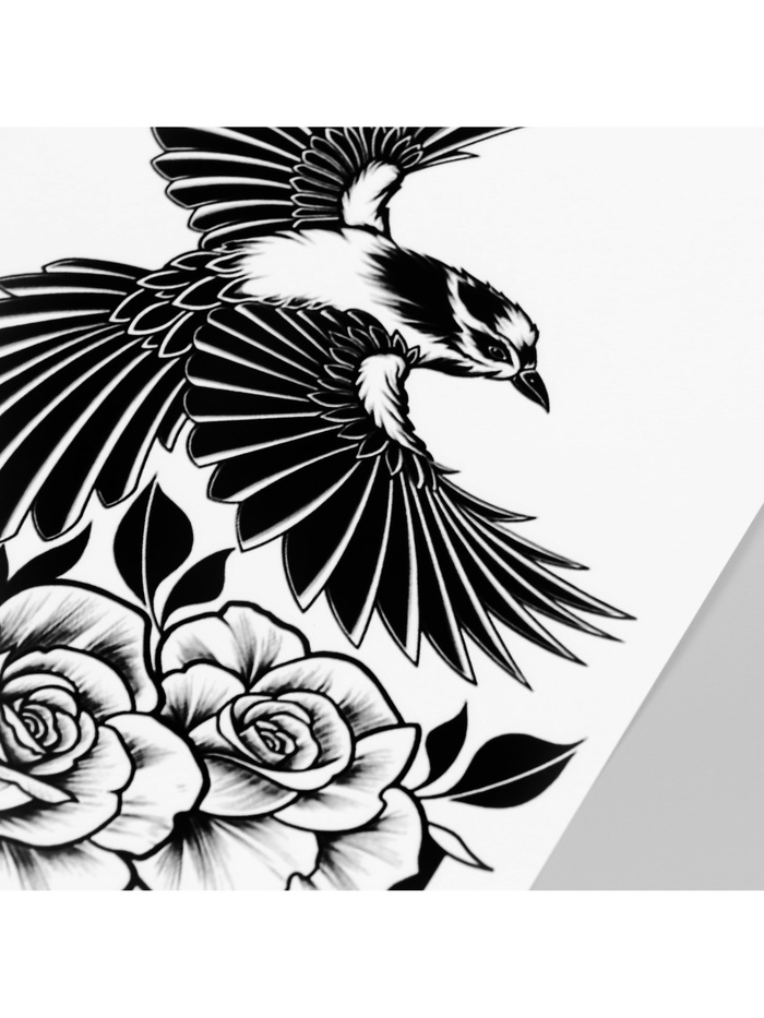 - Эффектный дизайн: Татуировка сочетает в себе образ изящной птицы и утонченные розы. Черный цвет придаст глубину и выразительность вашему стилю.