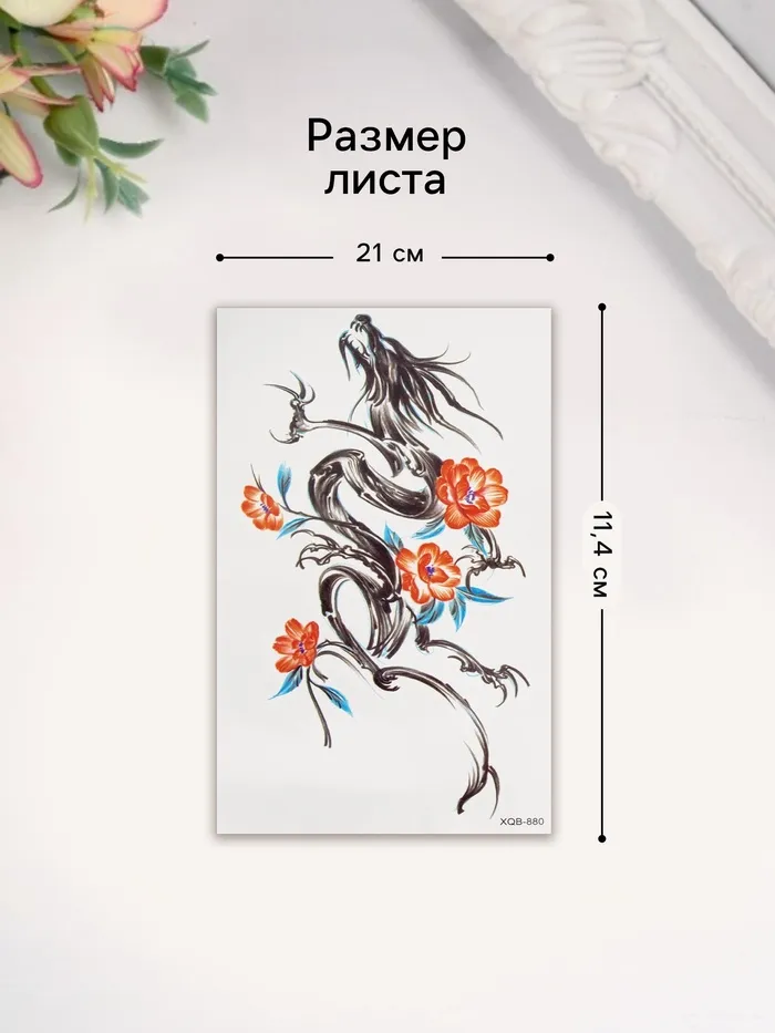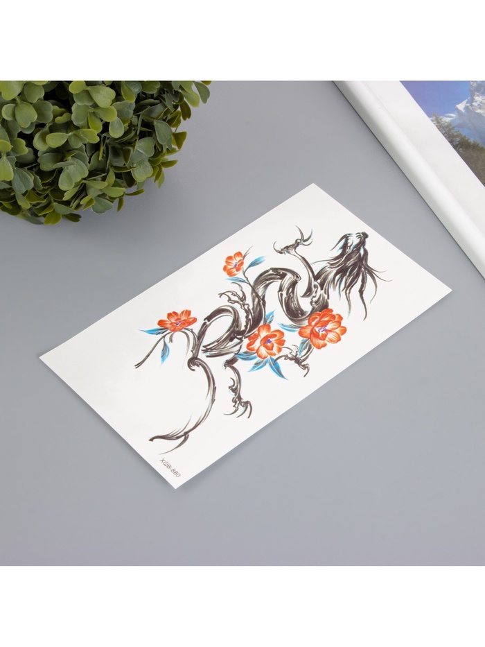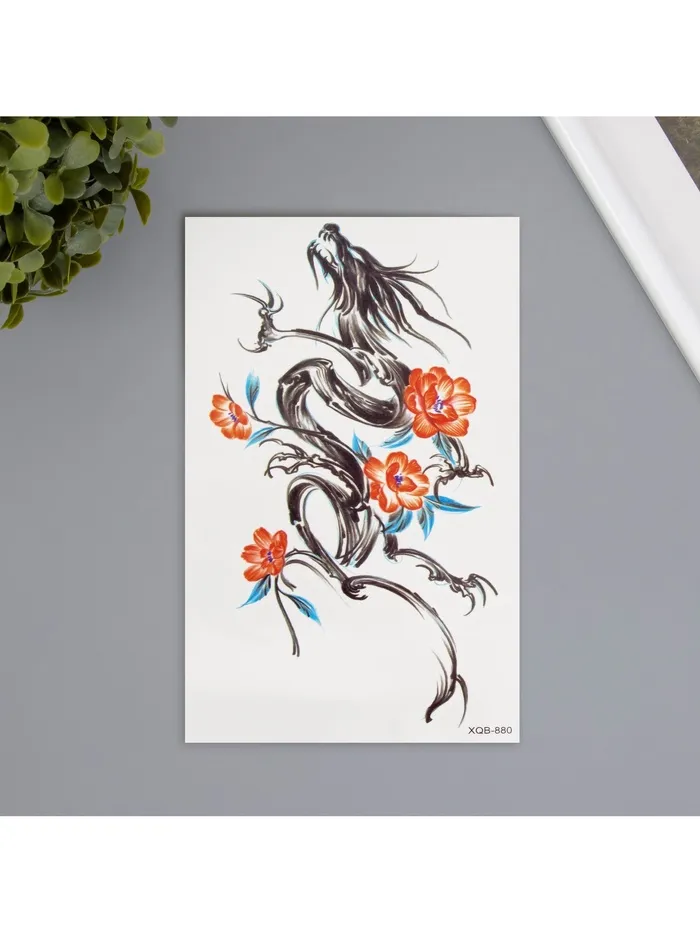 Переводная тату на тело цветная «Дракон чернильный с оранжевыми цветами», 11.4×21 см — Характеристики