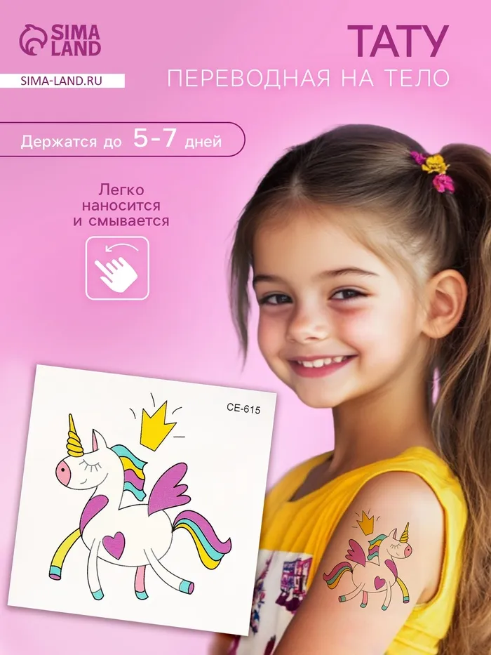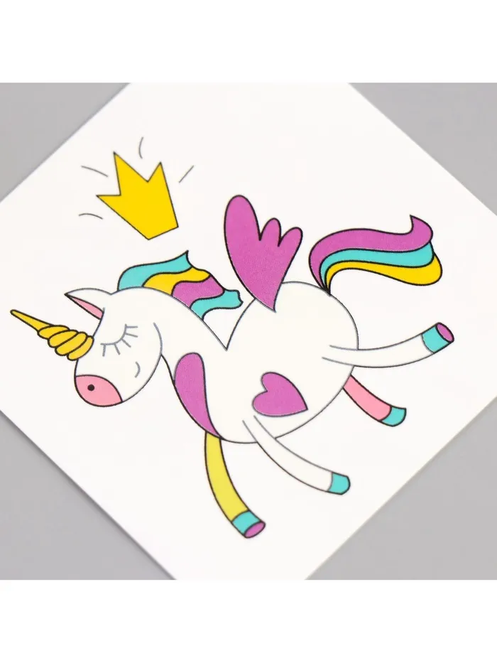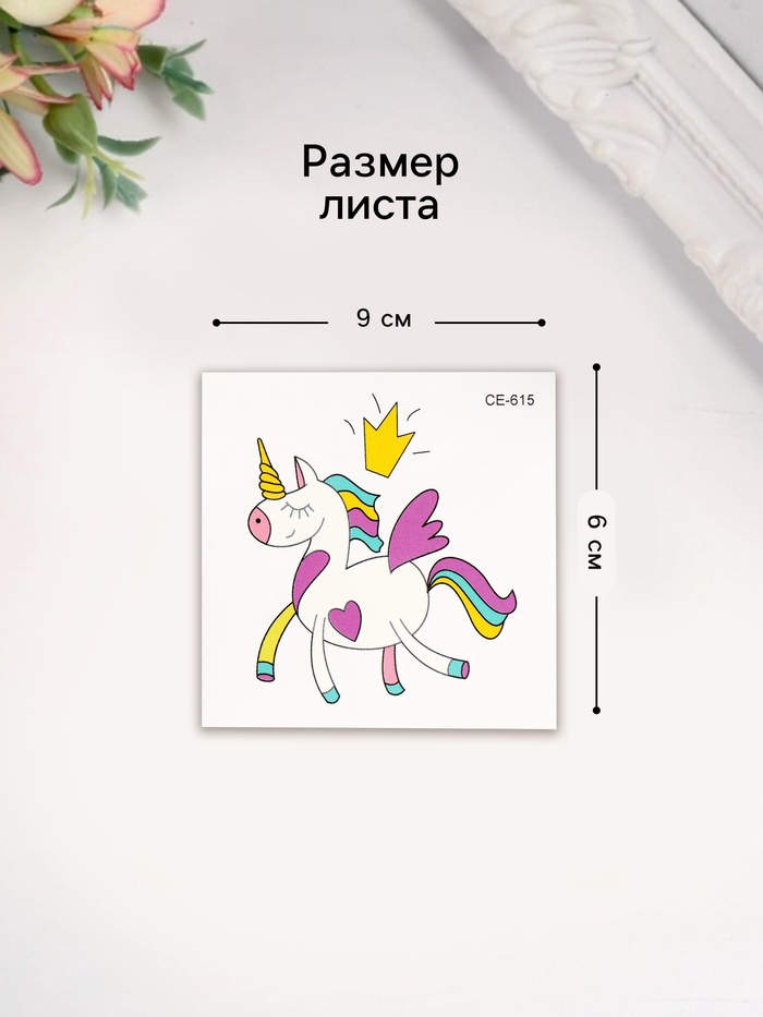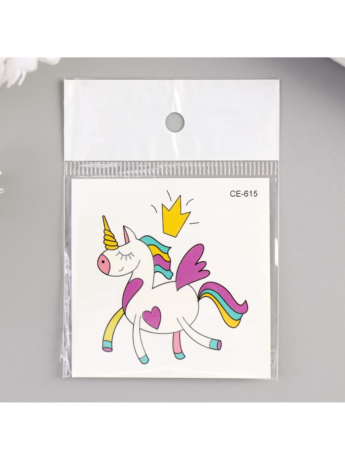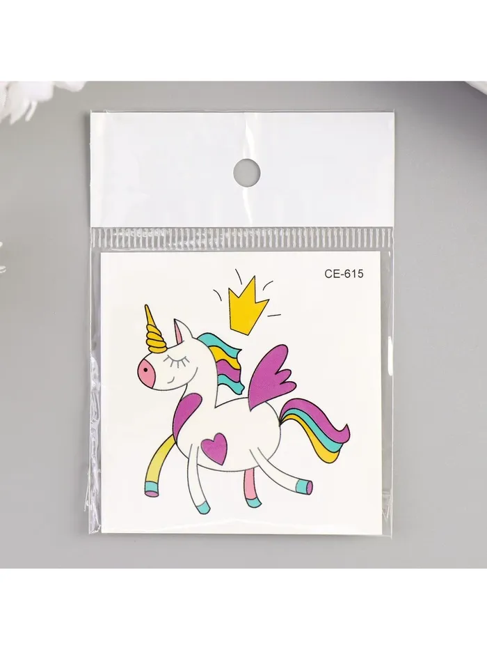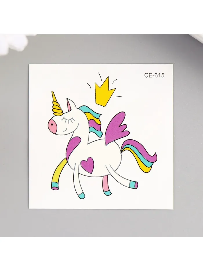 Позвольте себе или вашему ребёнку окунуться в мир волшебства и фантазии с изображением, которое наполнит образ радостью и игривостью. Переводная татуировка размером 6×6 см с единорожком в короне станет ярким акцентом, добавляя нотку магии в повседневную жизнь.