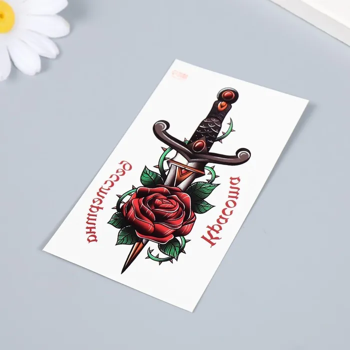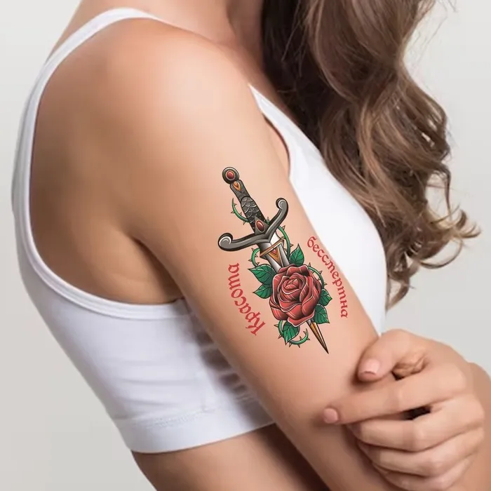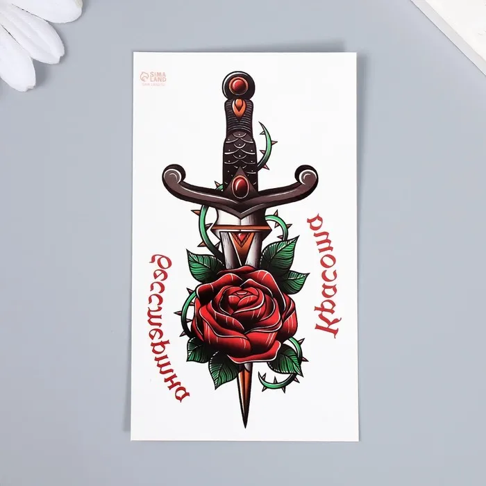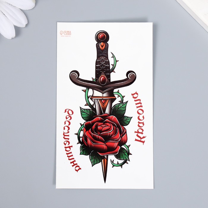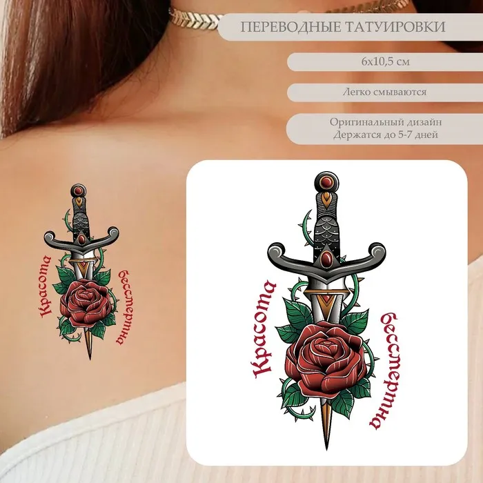 Переводная тату на тело цветная «Кинжал и роза: Красота бессмертна», 10.5×6 см — Характеристики