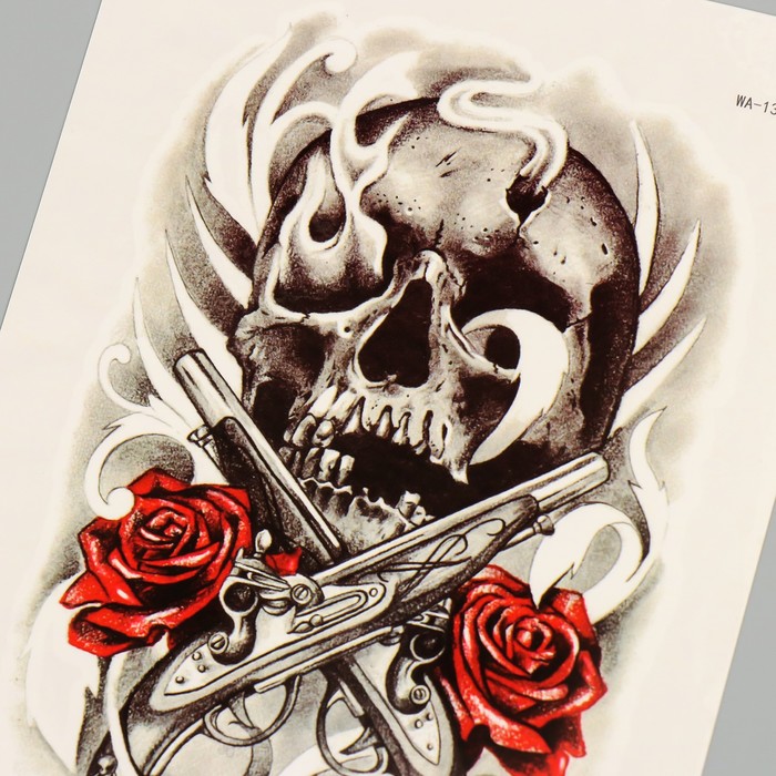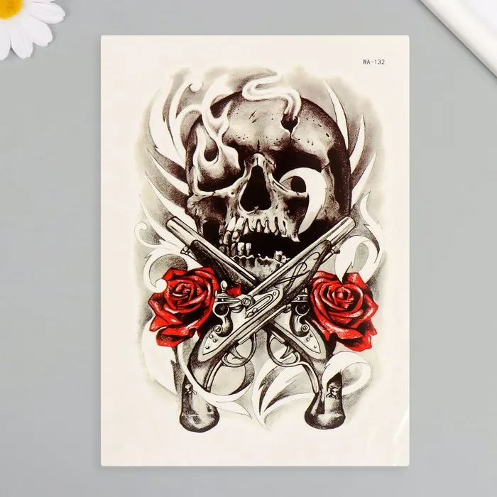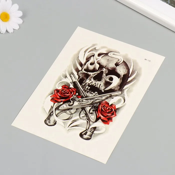 Представляем яркую переводную татуировку, которая перенесёт вас в атмосферу драматических историй и эпических схваток. Её дизайн вдохновлён темой «Конец дуэли», сочетая образы оружия, черепов и цветочно-растительных элементов в едином захватывающем рисунке. Цветное исполнение подчёркивает детали и создаёт ощущение динамики, привлекая внимание окружающих. Размер 26.1×14.6 см позволяет создать масштабный рисунок, который станет центральным элементом вашего образа.