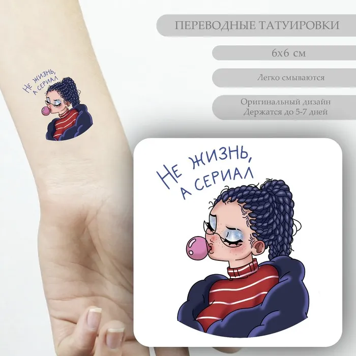 Переводная тату на тело цветная «Малышка с пузырём: Не жизнь, а сериал», 6×6 см — Характеристики