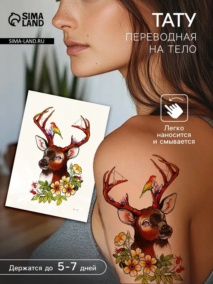 - Яркий дизайн: Переводная татуировка имеет разноцветное изображение оленя и птички. Она украсит ваш образ, добавив немного дикой природы и цвета в повседневную жизнь.
