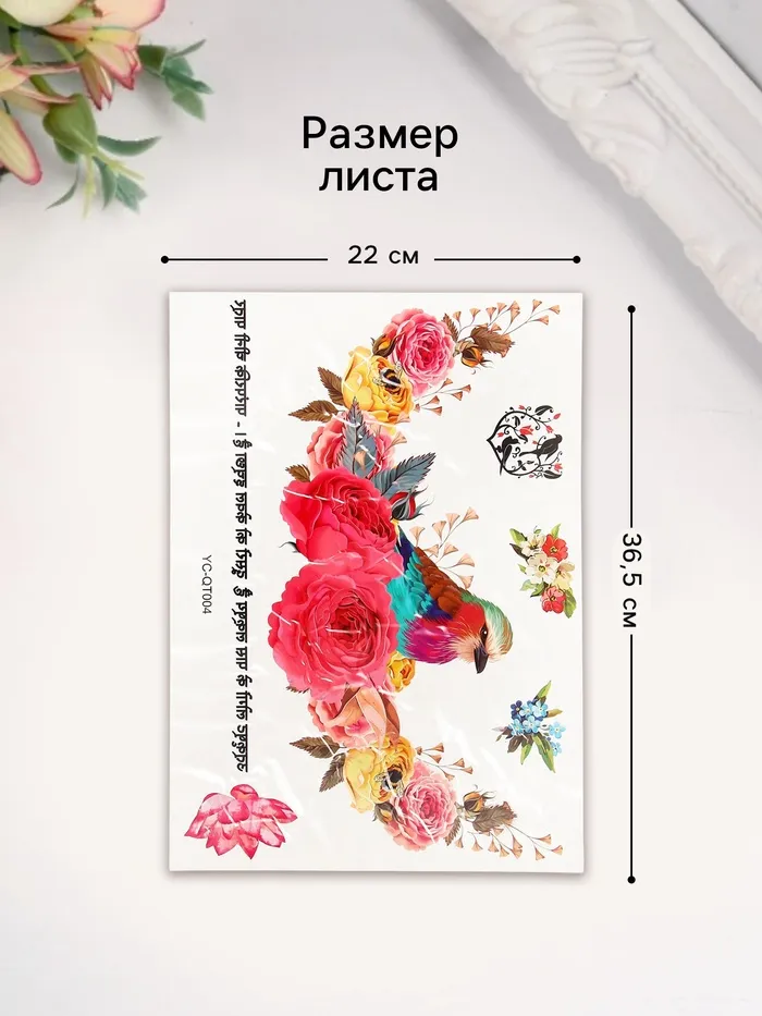 Переводная тату на тело цветная «Птица в розах», 36.5×22 см — Характеристики