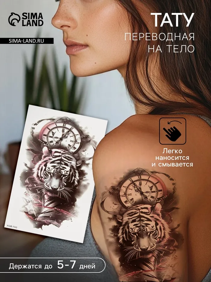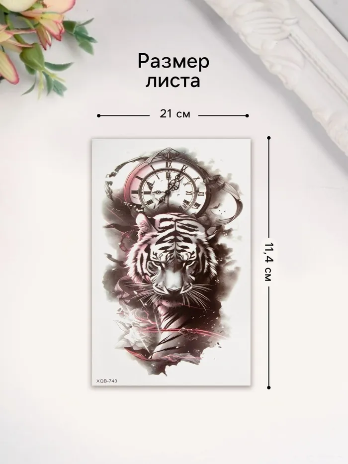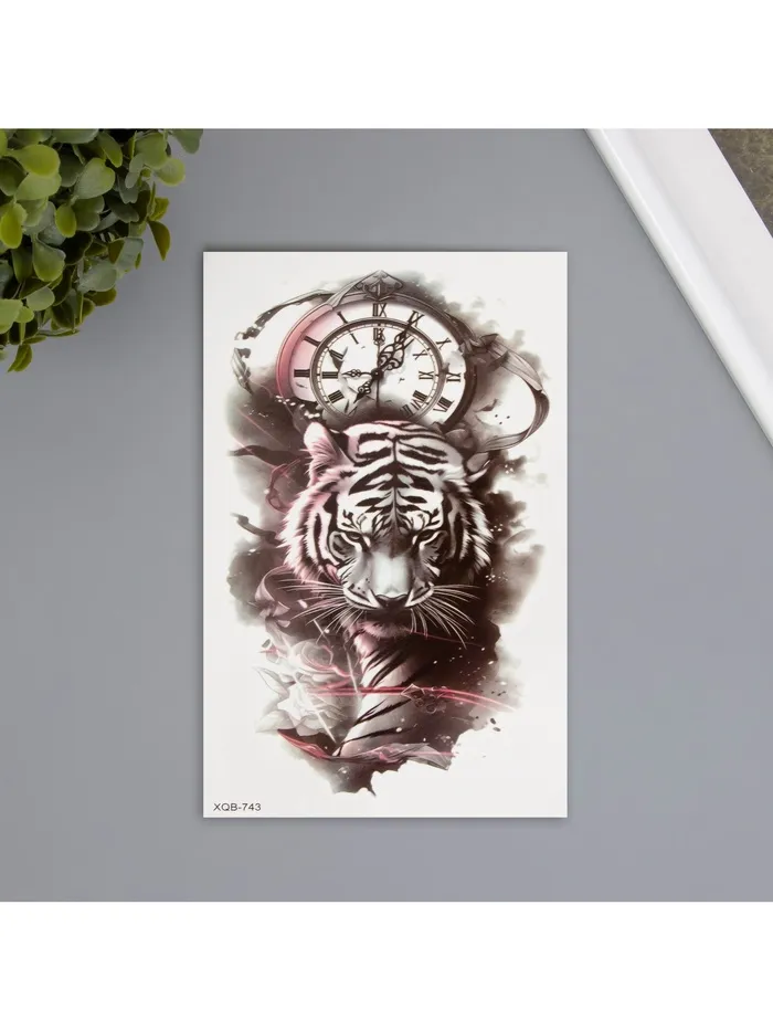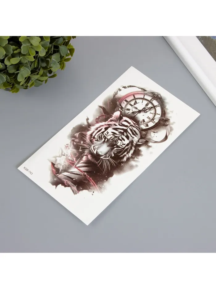 Переводная тату на тело цветная «Тиг на фоне часов», 11.4×21 см — Характеристики