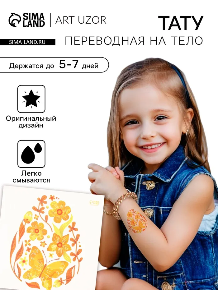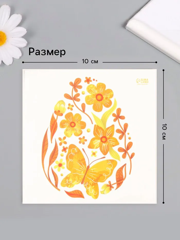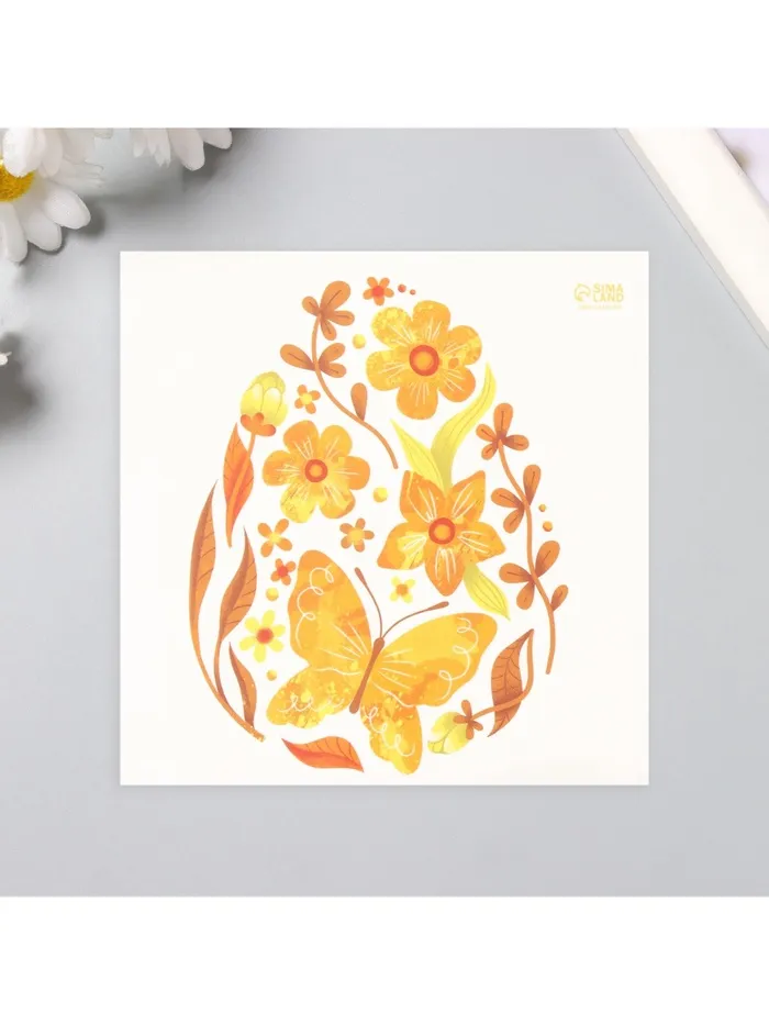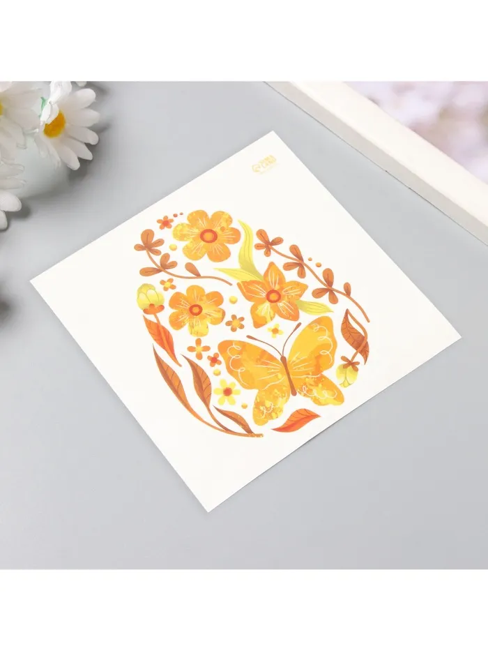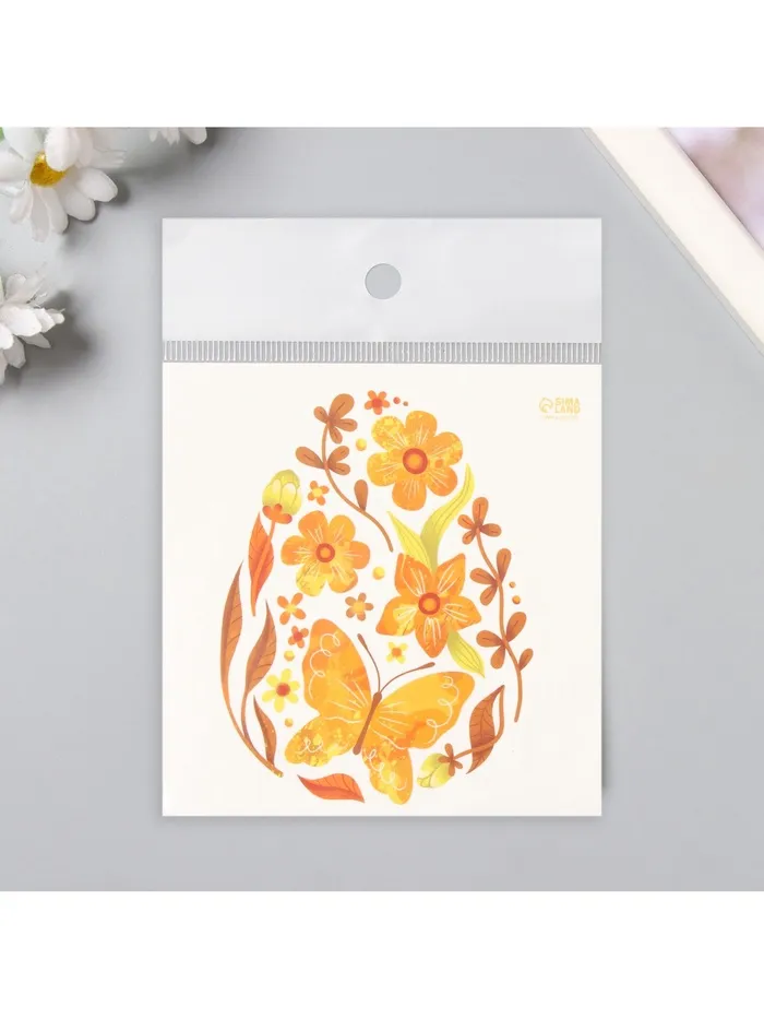 Представляем яркую цветную переводную татуировку, которая станет идеальным акцентом для создания праздничного и игривого образа. Её дизайн вдохновлён пасхальным яйцом с изящными жёлтыми узорами, дополненными элементами цветочно-растительной тематики и бабочками. Такое сочетание создаёт атмосферу весеннего волшебства и радости. Размер 10×10 см позволяет создать заметный и стильный акцент, который украсит как детский праздник, так и семейное торжество.