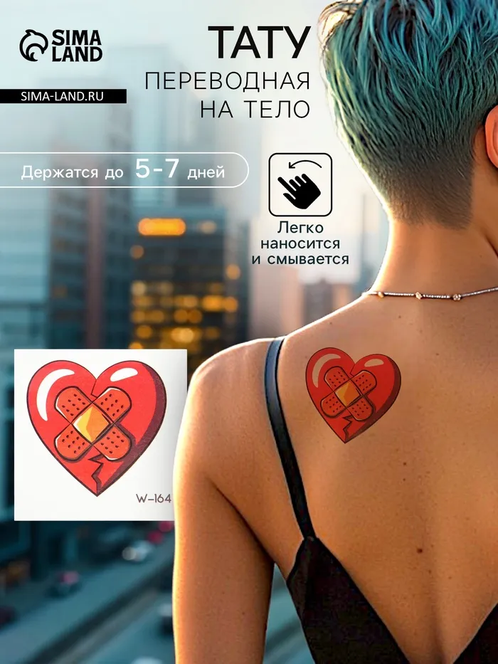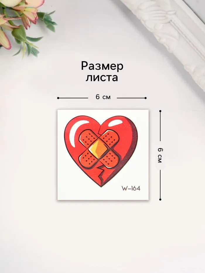 Представляем яркую цветную переводную татуировку, которая станет символом заботы и любви в вашем образе. Её дизайн вдохновлён изображением сердца с лейкопластырем, что символизирует исцеление, поддержку и заботу. Компактный размер (6×6 см) делает её универсальным выбором для украшения любого участка тела, а яркие цвета привлекают внимание и подчёркивают эмоции.