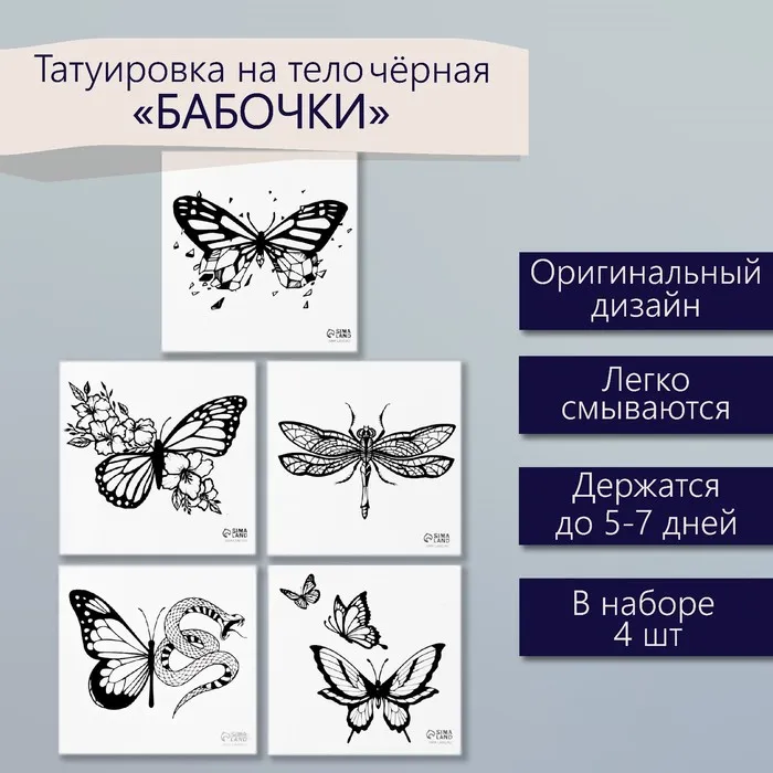 Создайте уникальный стиль с легкостью! Набор чёрных тату «Бабочки» — стильный акцент для любой девушки или женщины. Эти временные татуировки идеально подойдут для украшения тела, придавая образу загадочность и элегантность.