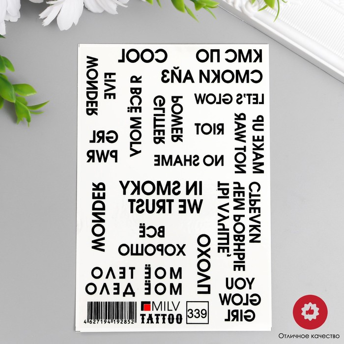 Эти стильные переводные надписи превратят ваше тело в холст для самовыражения. Чёткие шрифтовые композиции и цифры в чёрном цвете создают эффект профессиональной татуировки, позволяя каждый день носить новую философию на коже.