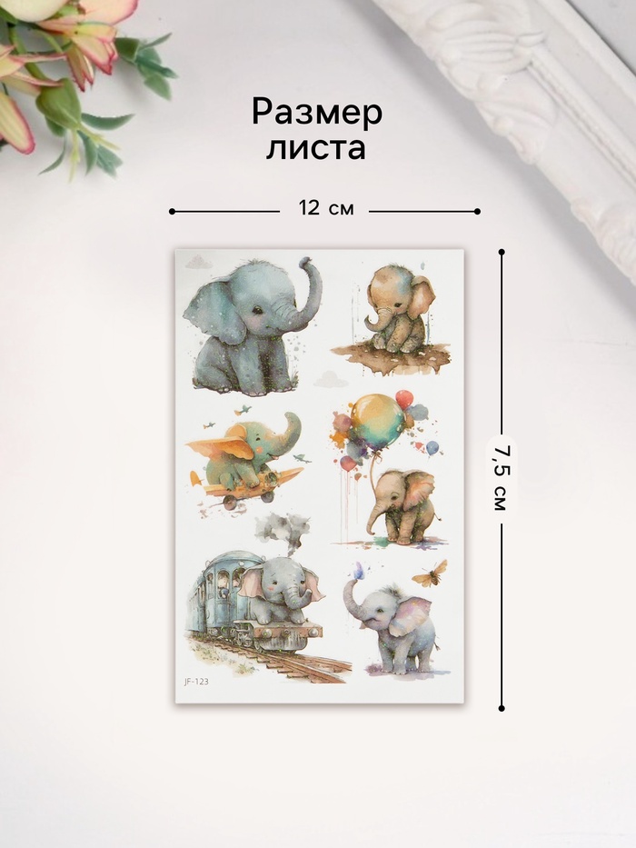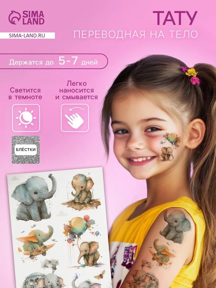 Переводные тату на тело светящиеся с блёстками «Слонёнок», 7.5×12 см — Характеристики