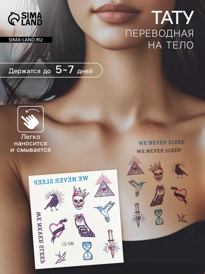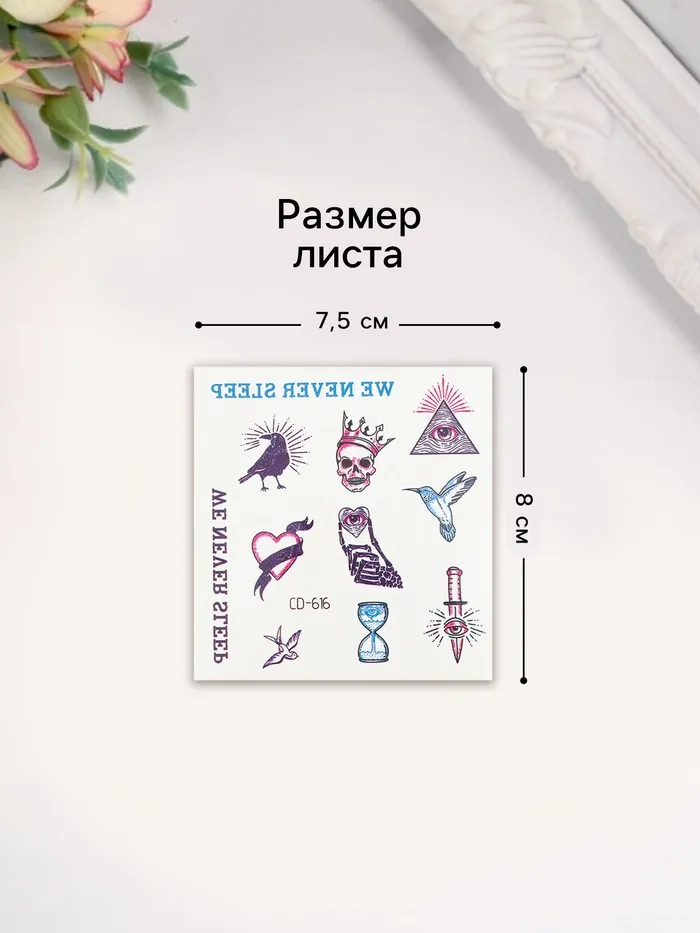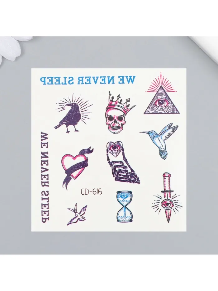 Эти переводные татуировки — это не просто украшение, а способ выразить свою индивидуальность и добавить в свой образ элемент необычности. Они помогут создать атмосферу загадочности и стиля, напоминая о важности творческого подхода к жизни.