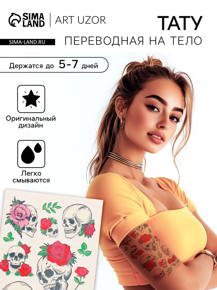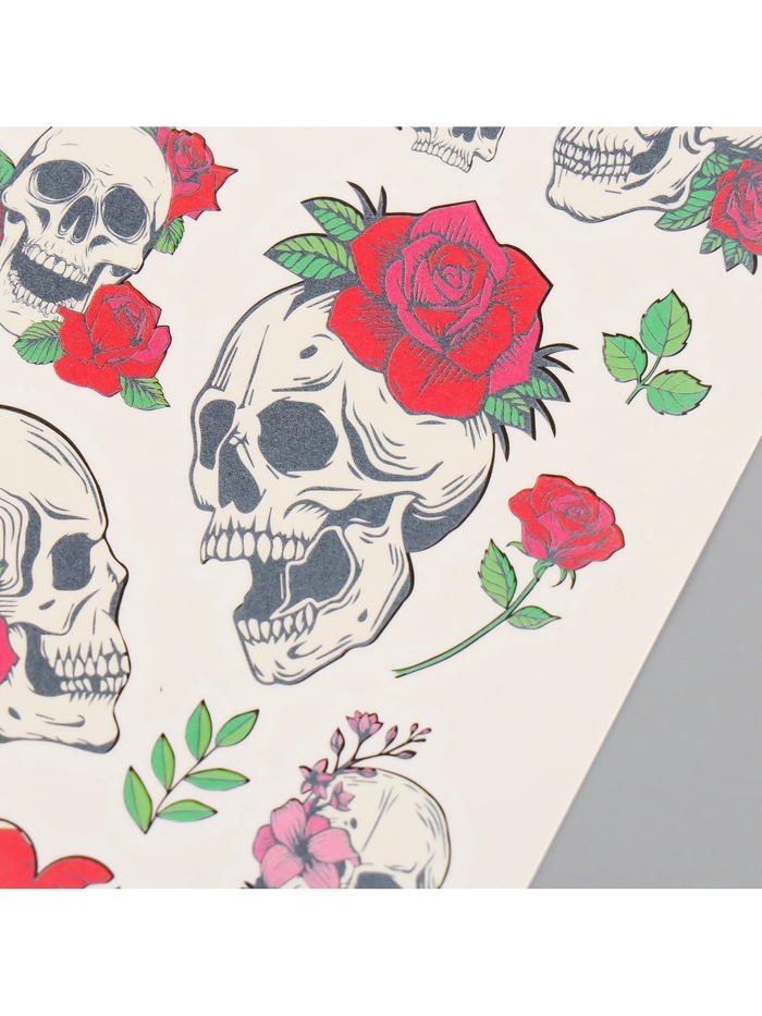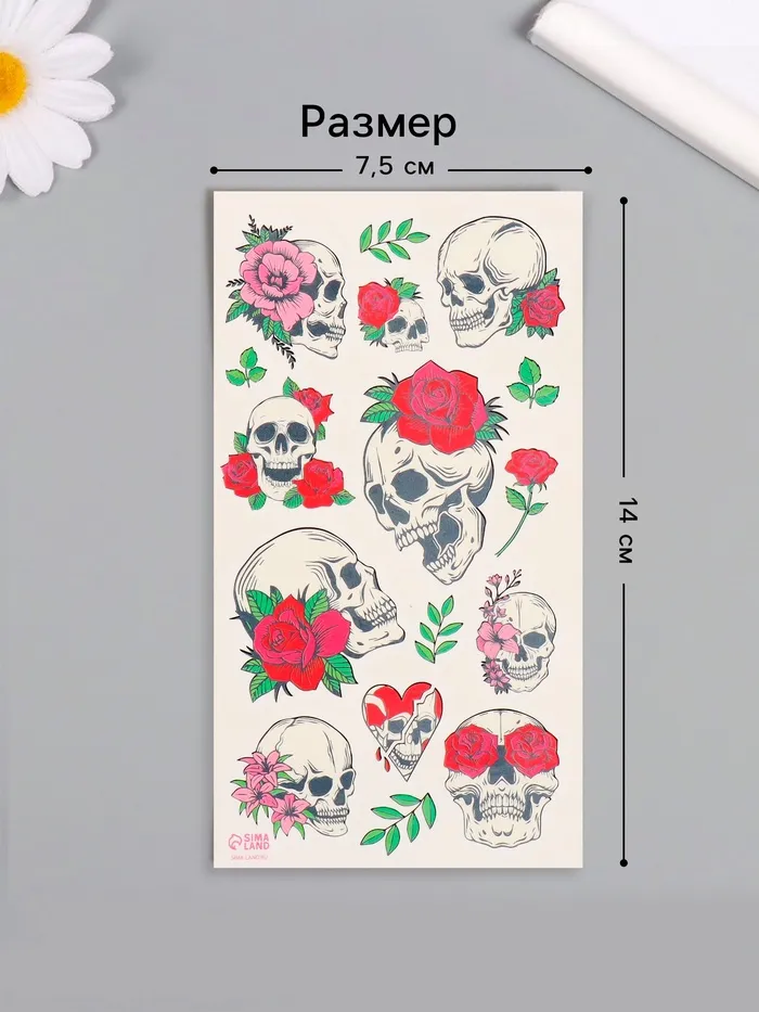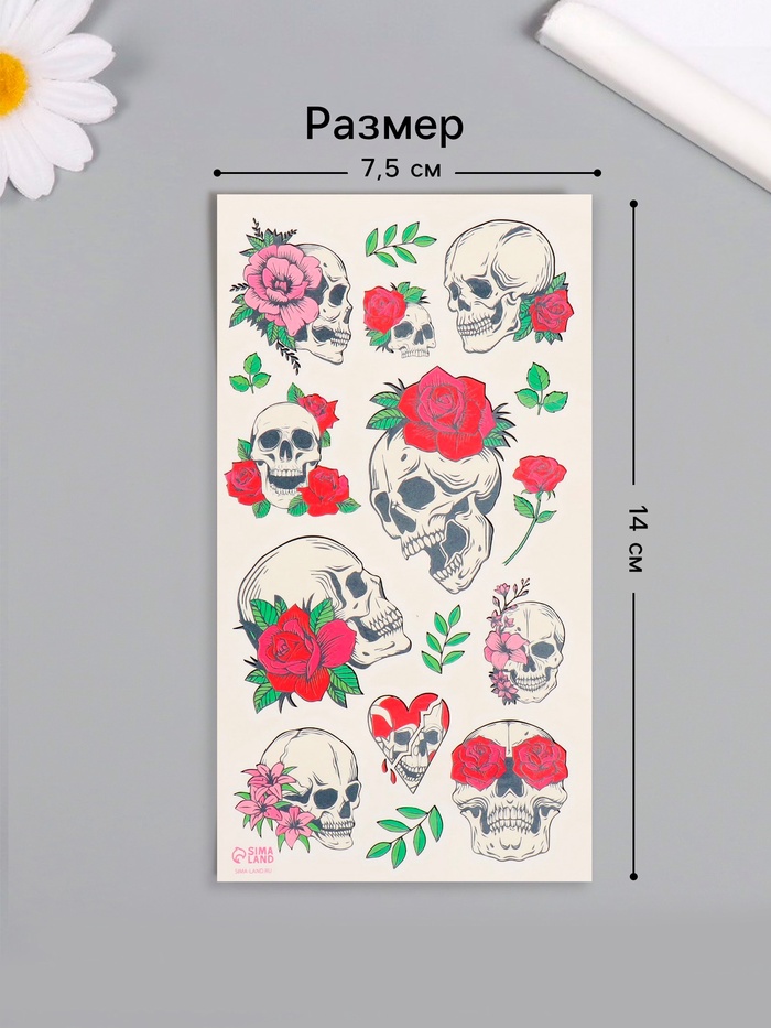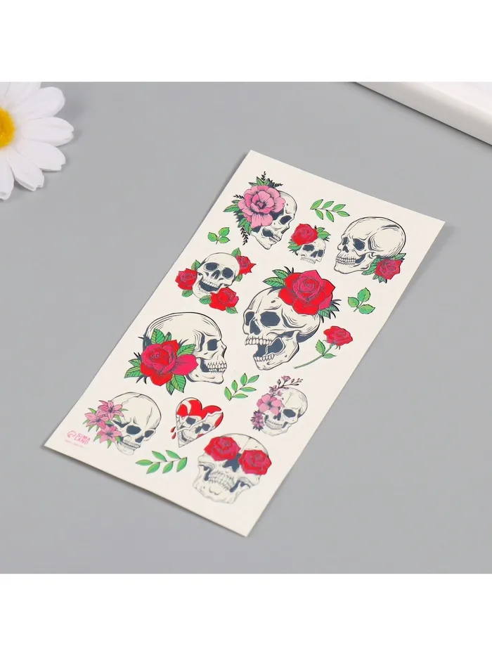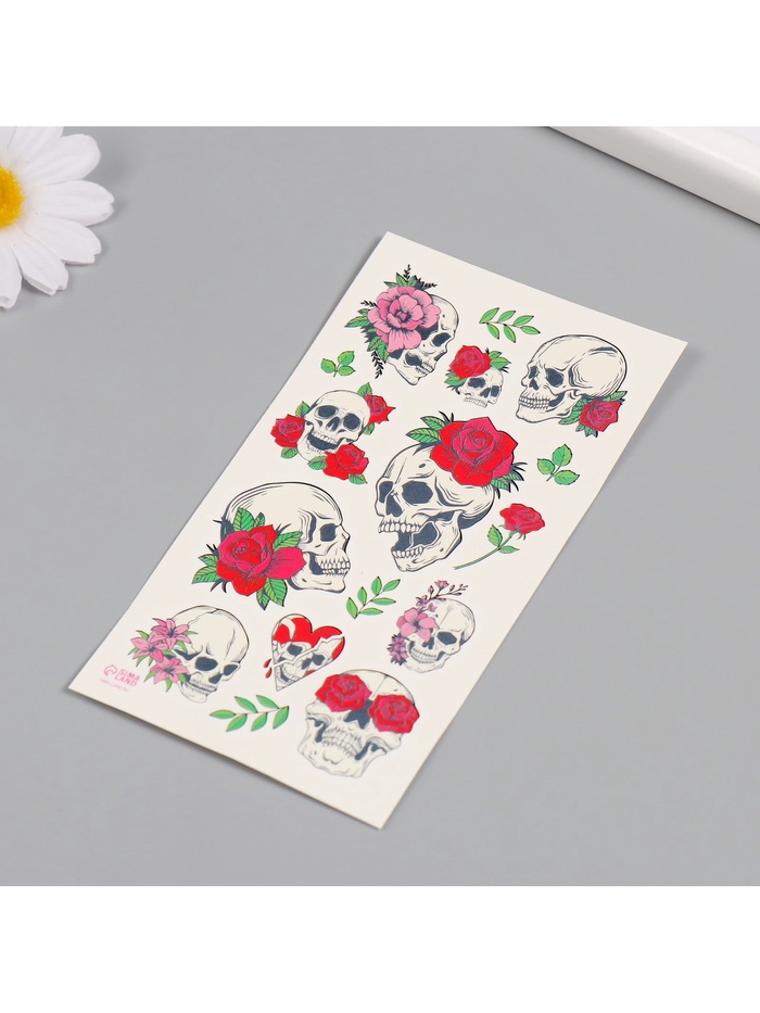Переводные тату на тело цветные «Черепа и розы», 7.5×14 см — Характеристики