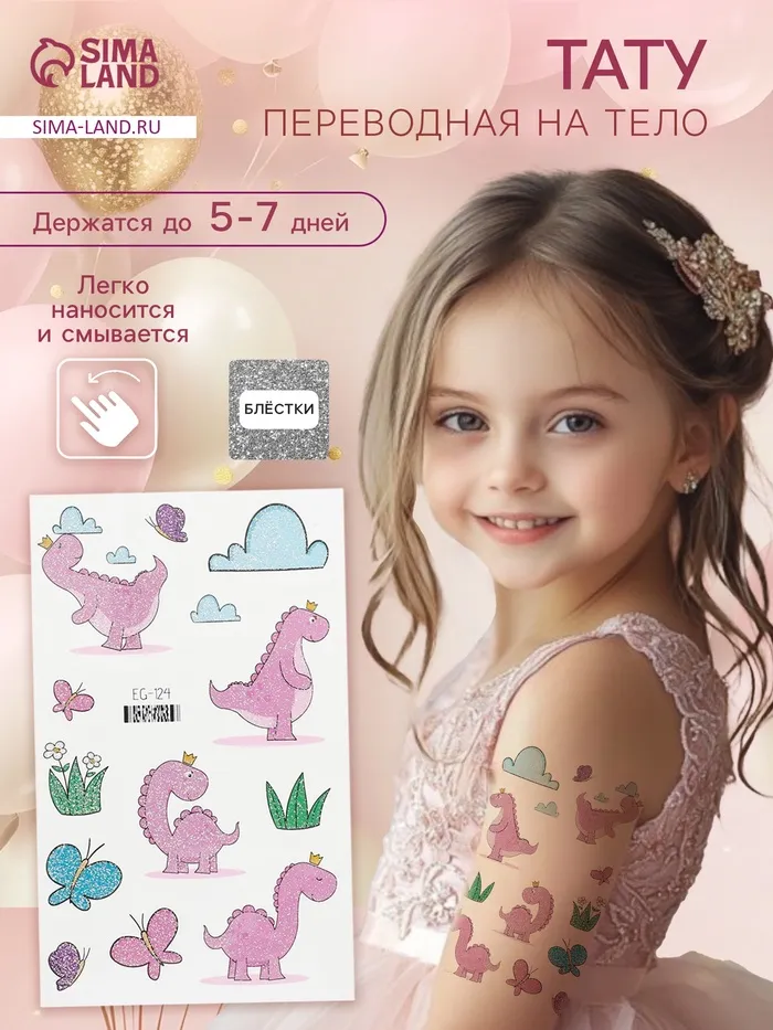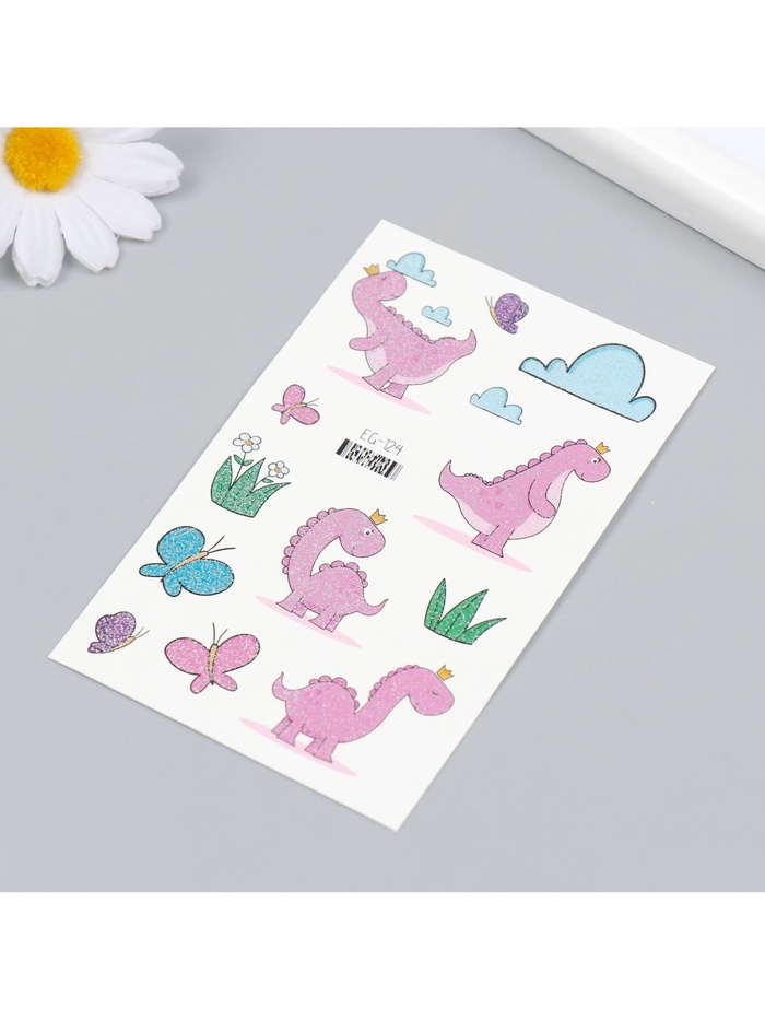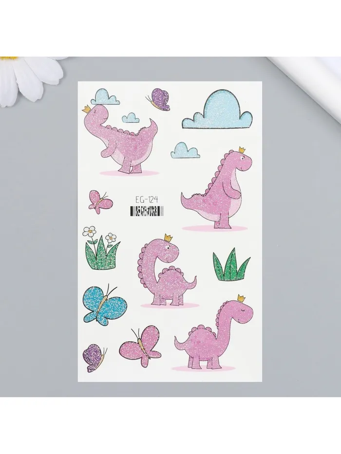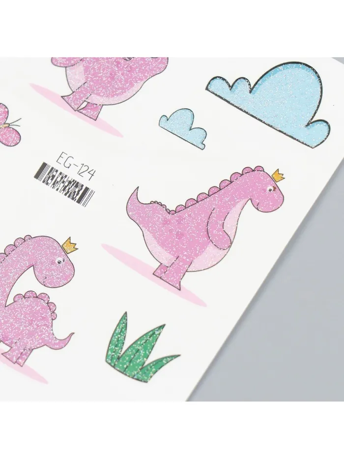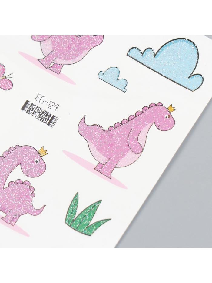 Переводные тату на тело цветные «Розовые динозаврики», блёстки, 12×7.5 см — Характеристики