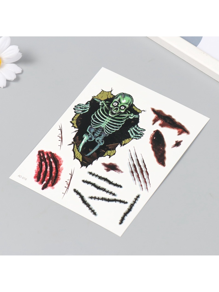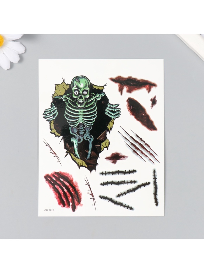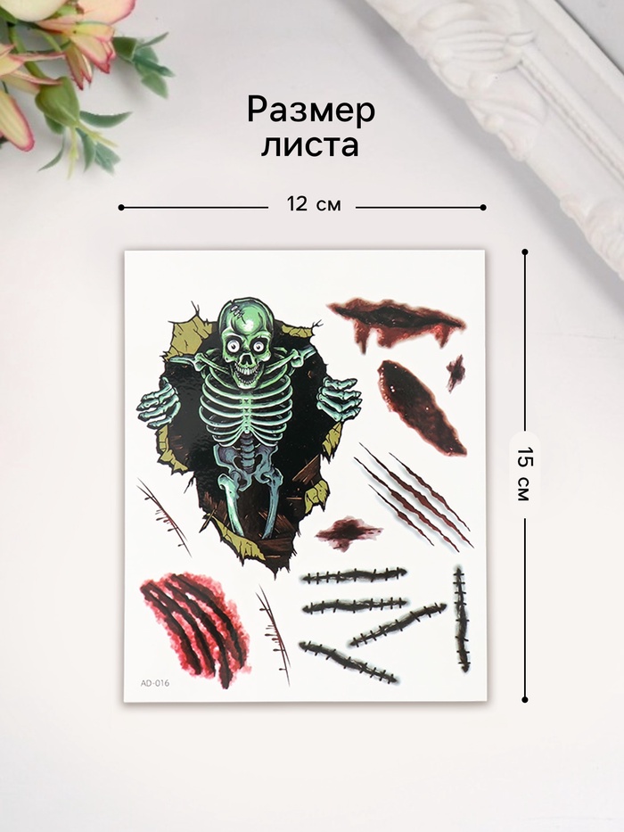 Представляем яркие переводные татуировки, которые станут идеальным выбором для создания эффектного и загадочного образа. Их дизайн вдохновлён изображениями скелета и ран, что добавляет им мрачной эстетики и драматизма. Цветное исполнение подчёркивает детали и создаёт ощущение реалистичности, привлекая внимание окружающих. Размер 12×15 см позволяет создать масштабный рисунок, который станет настоящим акцентом вашего внешнего вида.