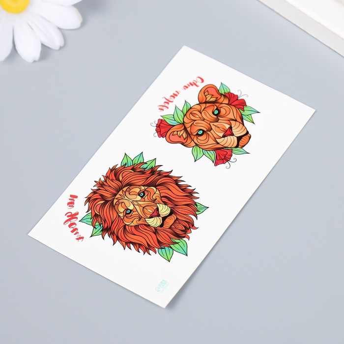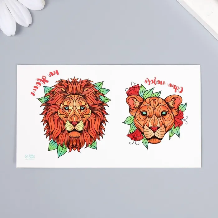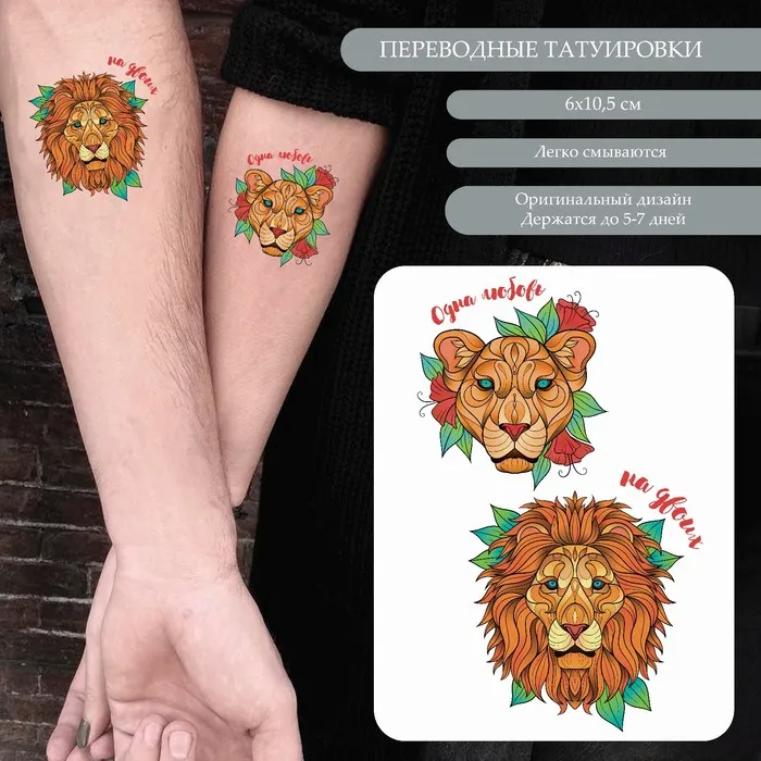 Переводные тату парные «Лев и львица: Одна любовь», временные татуировки цветные, 10.5×6 см — Характеристики