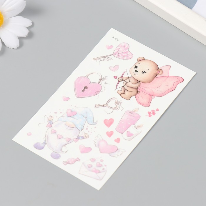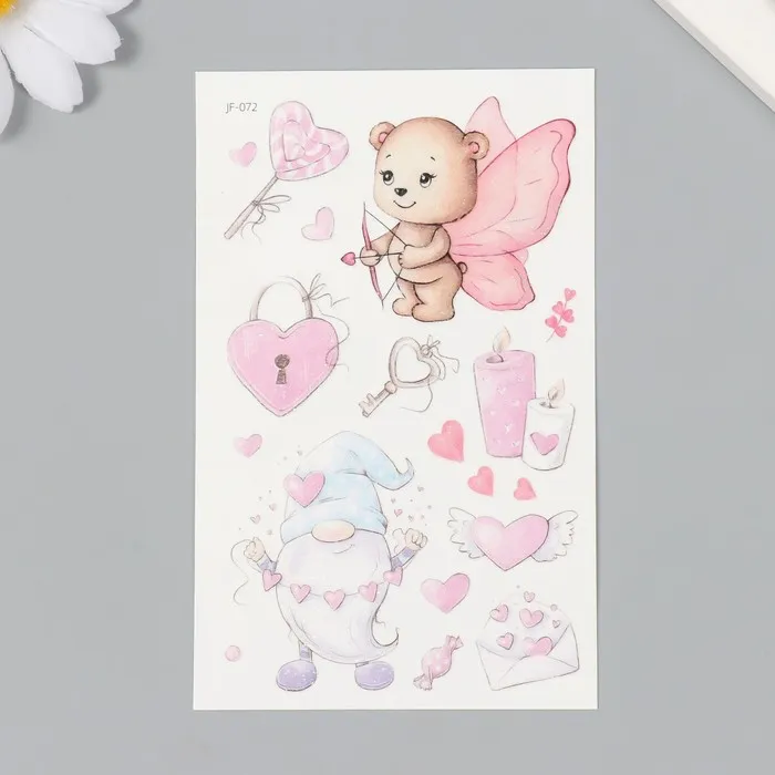 Представляем очаровательные цветные переводные татуировки, которые станут идеальным способом выразить свои чувства и добавить в образ нотку магии. Их дизайн вдохновлён милыми персонажами — гномом и мишкой, окруженными сердечками, что создаёт атмосферу тепла и романтики. Благодаря светящемуся эффекту и мерцающему глиттеру, эти татуировки будут привлекать внимание даже в темноте. Размер 7.5×12 см делает их заметным акцентом, который украсит как праздничный вечер, так и повседневный стиль.